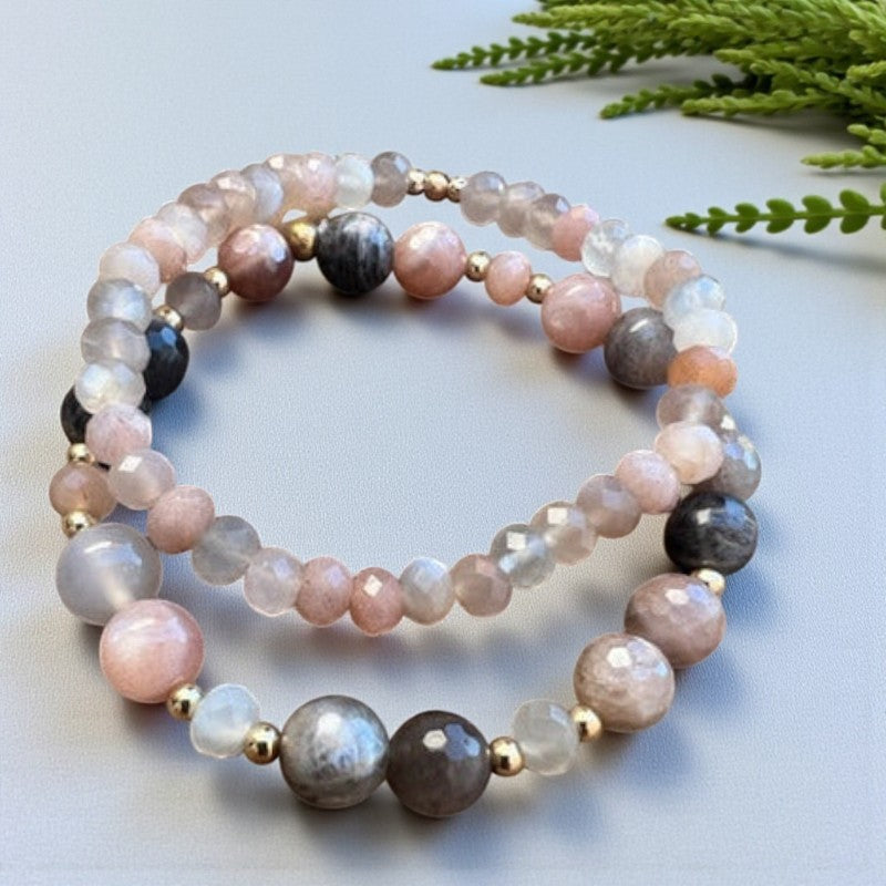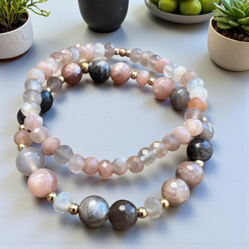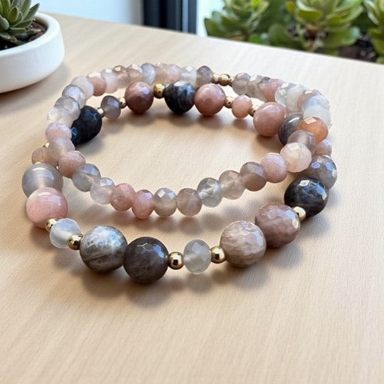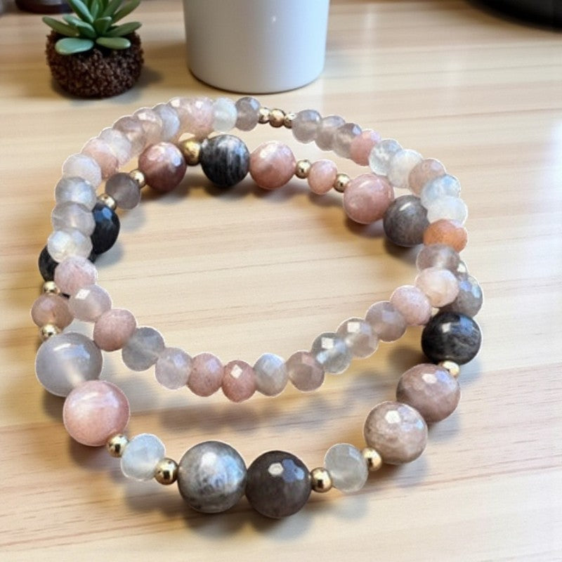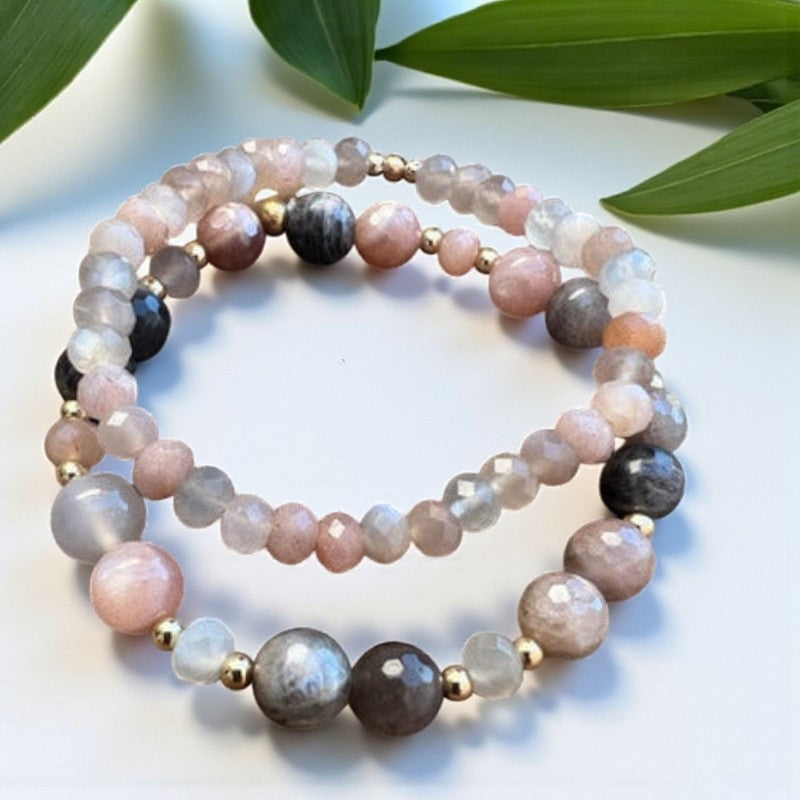 Paired with sunstone and accented with 14k gold beads, this bracelet ensemble serves as a potent catalyst for infusing joy and positivity into your life's journey. By adorning yourself with this significant set, grant yourself the gift of unconditional self-love and bask in the knowledge that you illuminate the world with your unique light. Moonstone, a stone of the divine feminine associated with the sacral Chakra, resonates with the essence of creativity, sensuality, and emotional equilibrium.