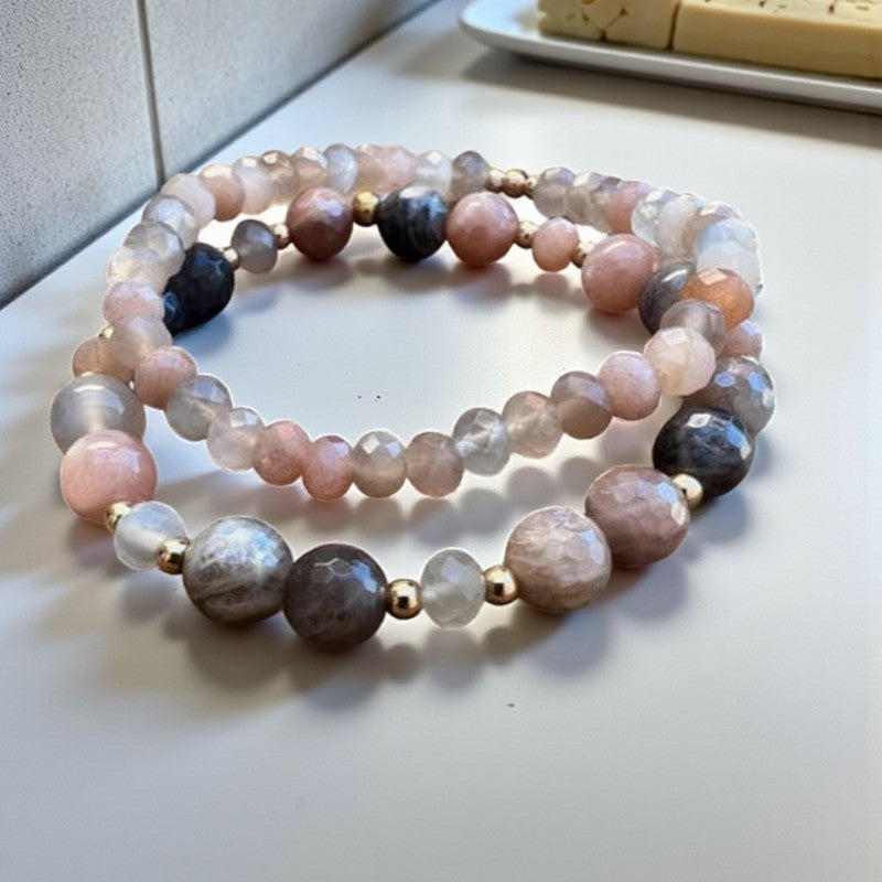 Illuminate the Universe: Sunstone, Peach, and Rainbow Moonstone Bracelet Ensemble
