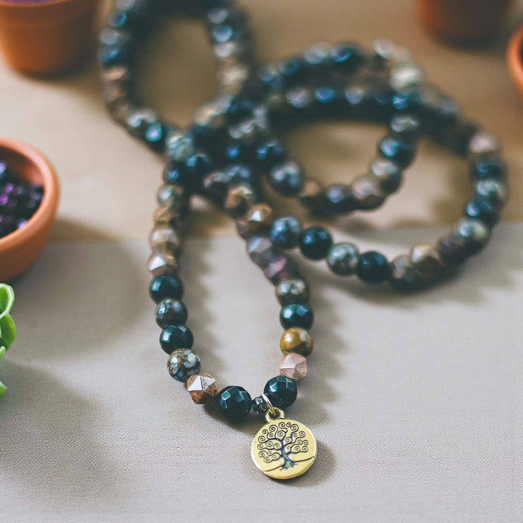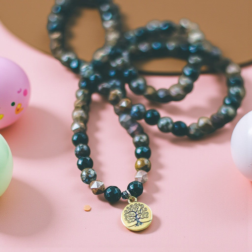 The fiery allure of fire lace opal draws the eye, while the lustrous black onyx adds a touch of brilliance. However, it is the star-cut African green opal that steals the show, infusing the ensemble with drama and enchantment. Adorned with a gold tree of life charm that can be worn as a pendant or dangle from the bracelet, this piece is sure to garner admiration and praise wherever you go.