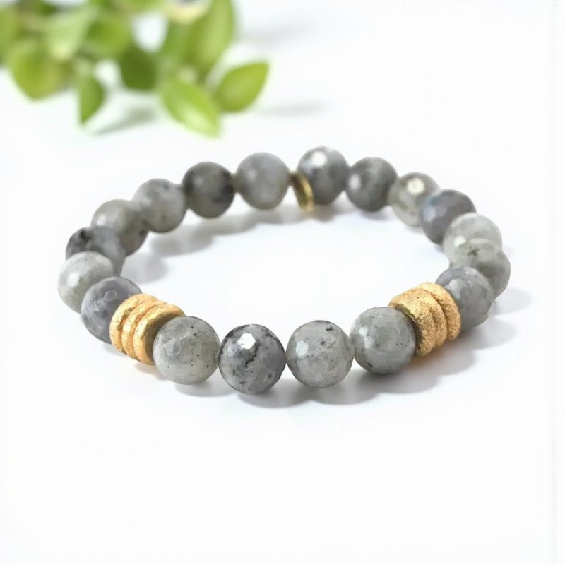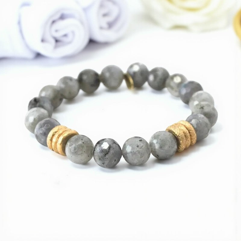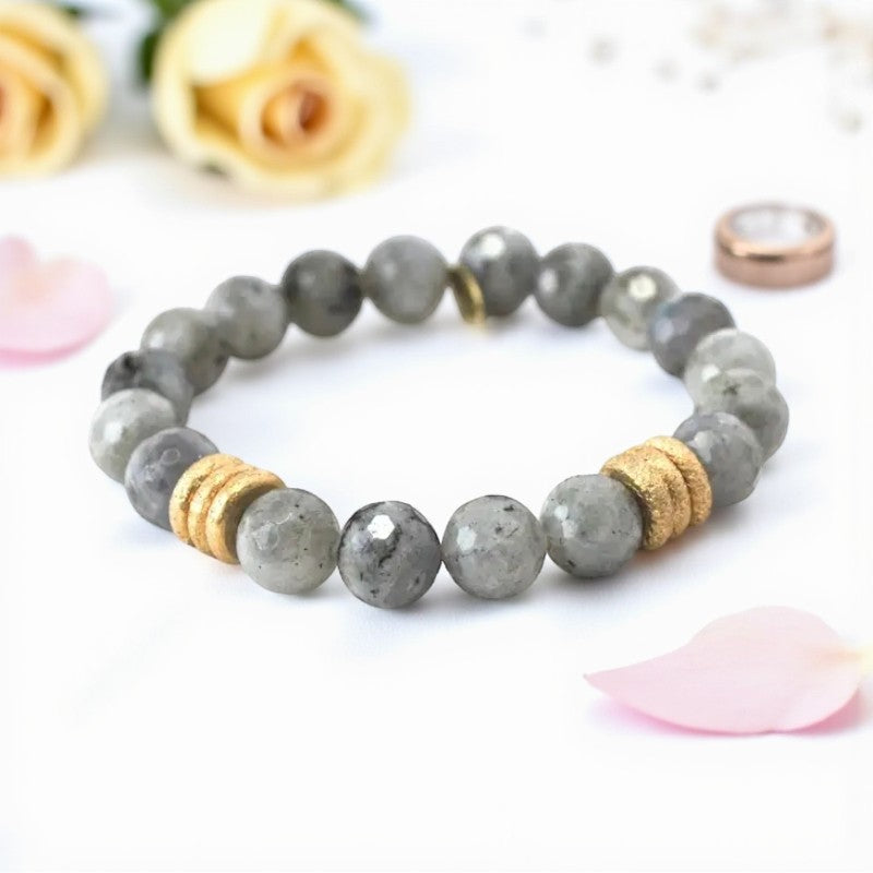 This bracelet is designed to calm an overactive mind, stimulate the imagination, and alleviate anxiety and stress, fostering a sense of inner peace and clarity. Labradorite acts as an aura protector, creating a shield against negative energies and promoting emotional stability. It also enhances intuition and willpower, banishing fears and insecurities while regulating metabolism, lowering blood pressure, and aiding in digestion for overall well-being.
