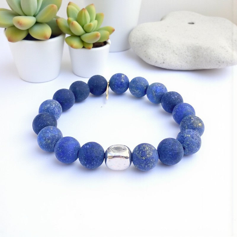 Distinguished by its deep blue hue and the shimmering platinum hematite center stone, this bracelet serves as a symbol of protection, peace, and inner strength. Whether worn by men or women, it radiates a sense of confidence and emotional depth, empowering individuals to express their feelings with authenticity and grace while staying grounded and centered.