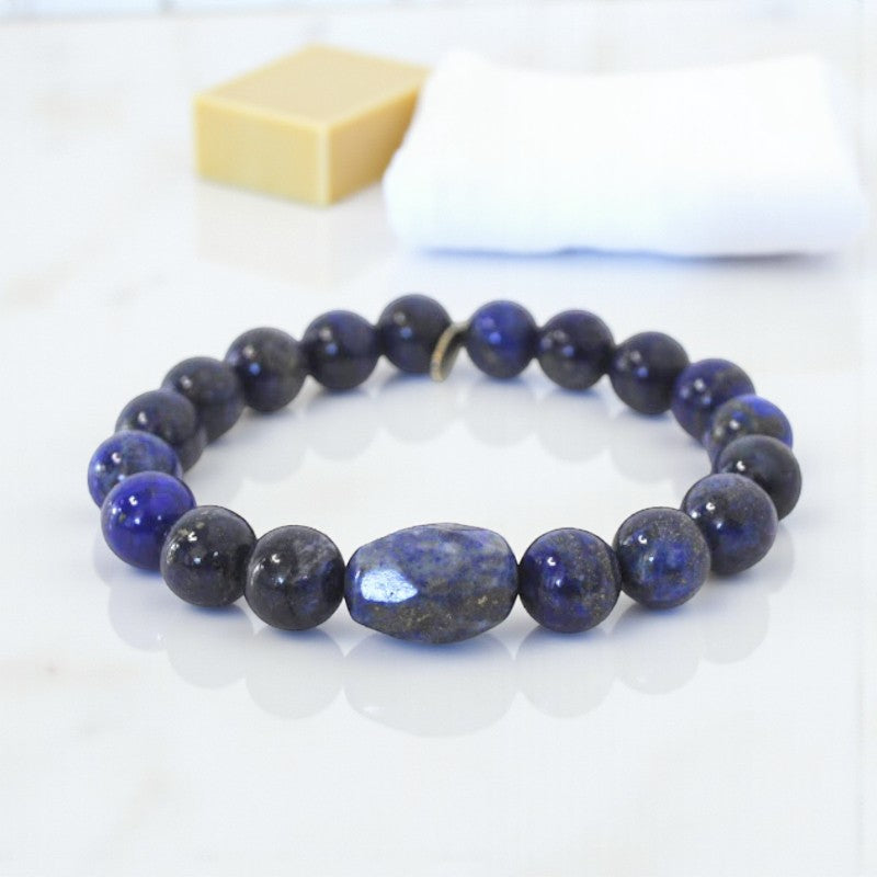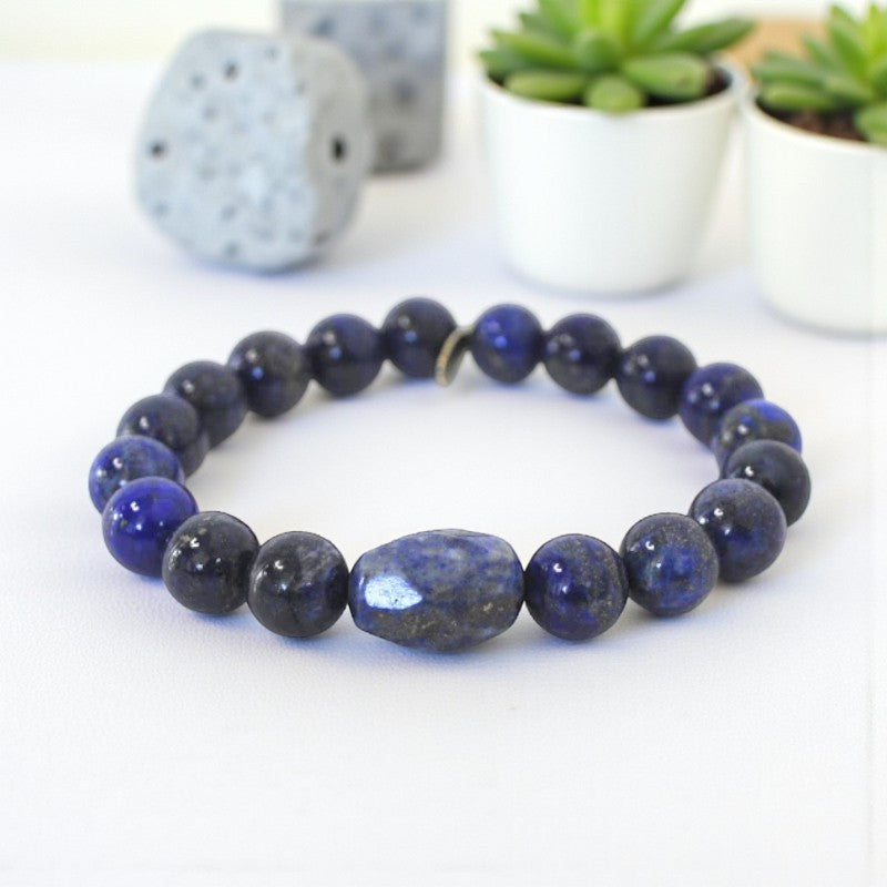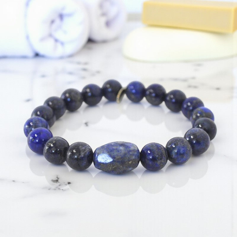 Distinguished by its deep blue hue and captivating golden flecks of pyrite, Lapis Lazuli stands out as a stone of protection and inner peace. Whether worn by men or women, this bracelet exudes compassion and encourages the comfortable expression of emotions and feelings.