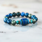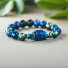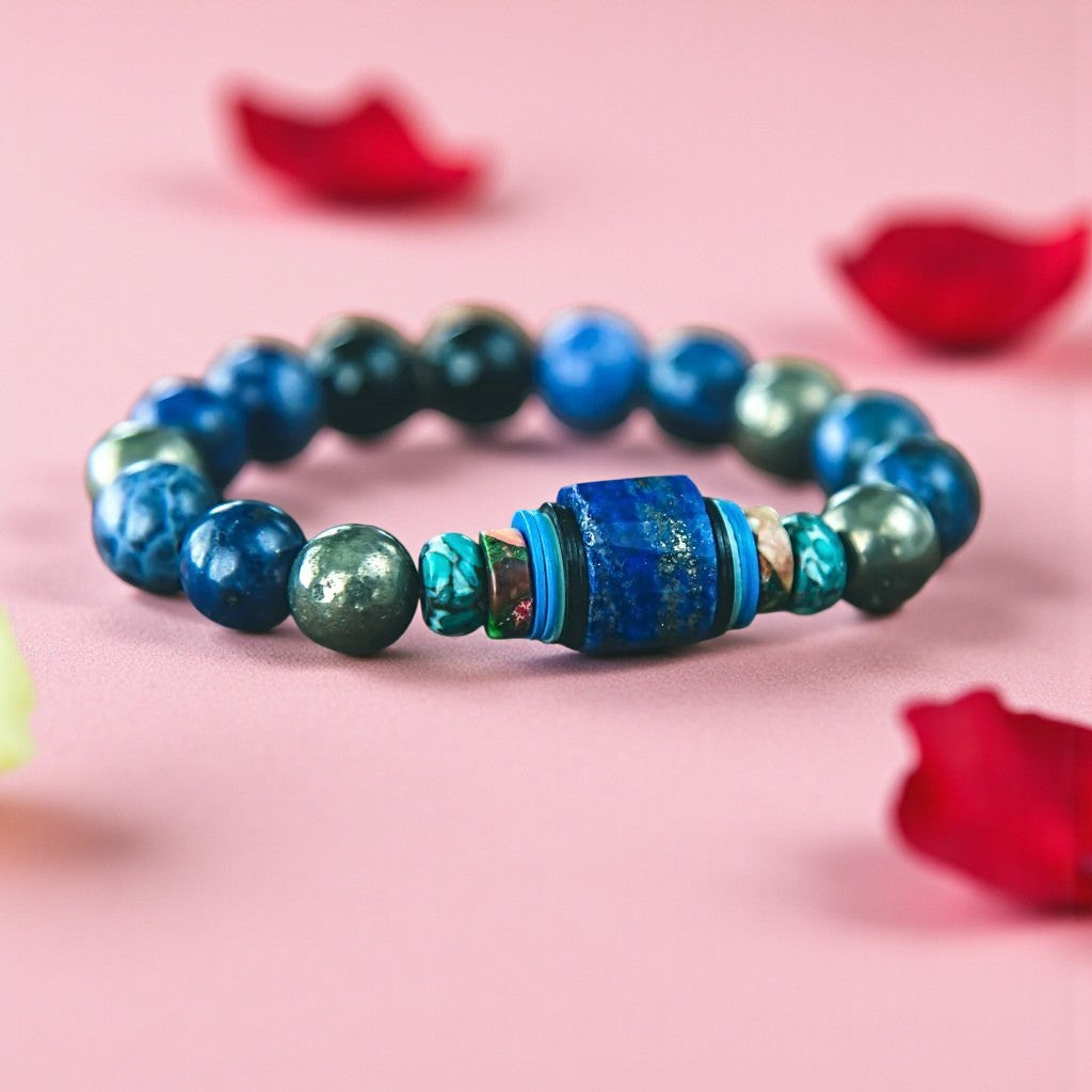 The vibrant blue of lapis lazuli harmonizes with the grounding black onyx and earthy tones of sodalite and pyrite, culminating in a bracelet of enchanting beauty. Adorn yourself with this transformative piece and witness the diva within you emerge. Wear this bracelet to unlock the inherent powers of these stones and embrace your authentic self.