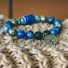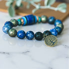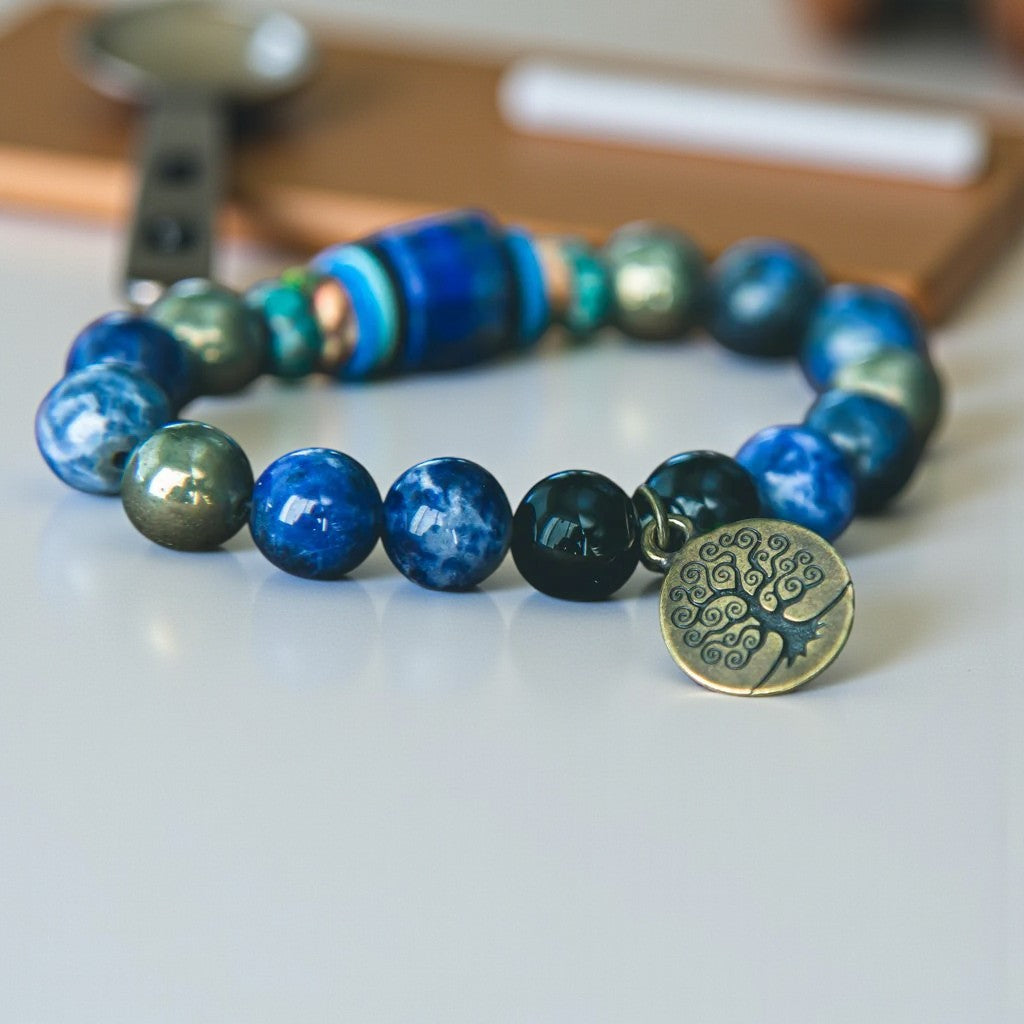 Black onyx, a stabilizing force, anchors us in positivity and clarity as we navigate life's decisions and focus on our future endeavors. Sodalite, a stone of consciousness and mindfulness, empowers us to assert ourselves while maintaining emotional equilibrium. The brass tree of life charm serves as a poignant symbol of interconnectedness and growth, completing this harmonious ensemble.
