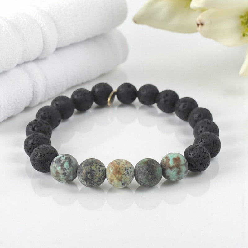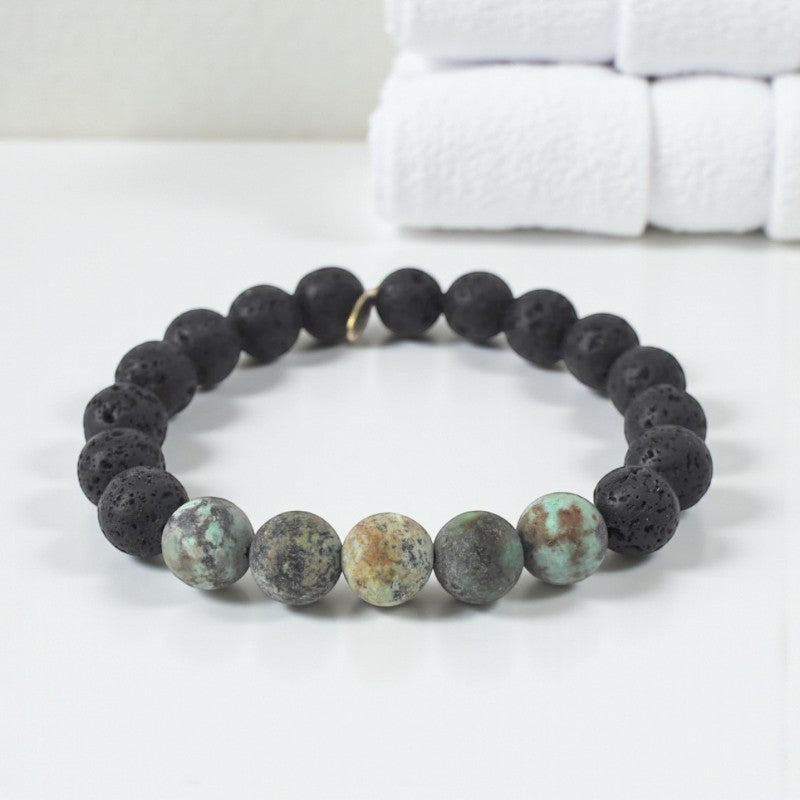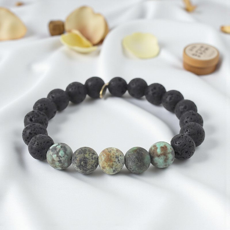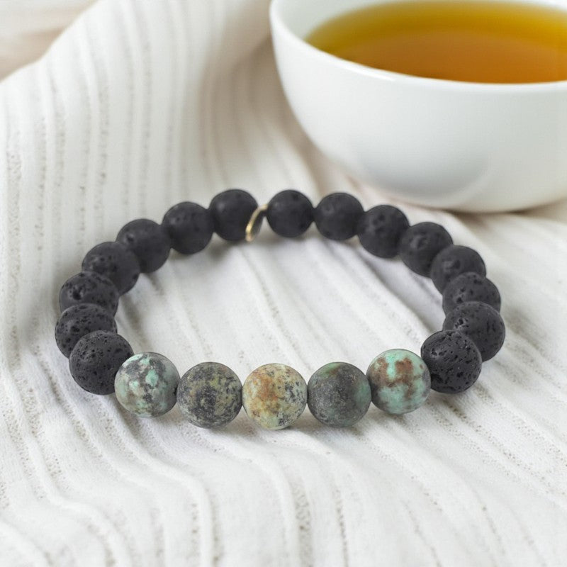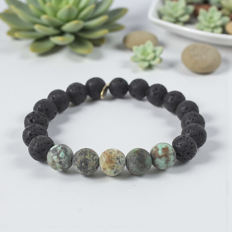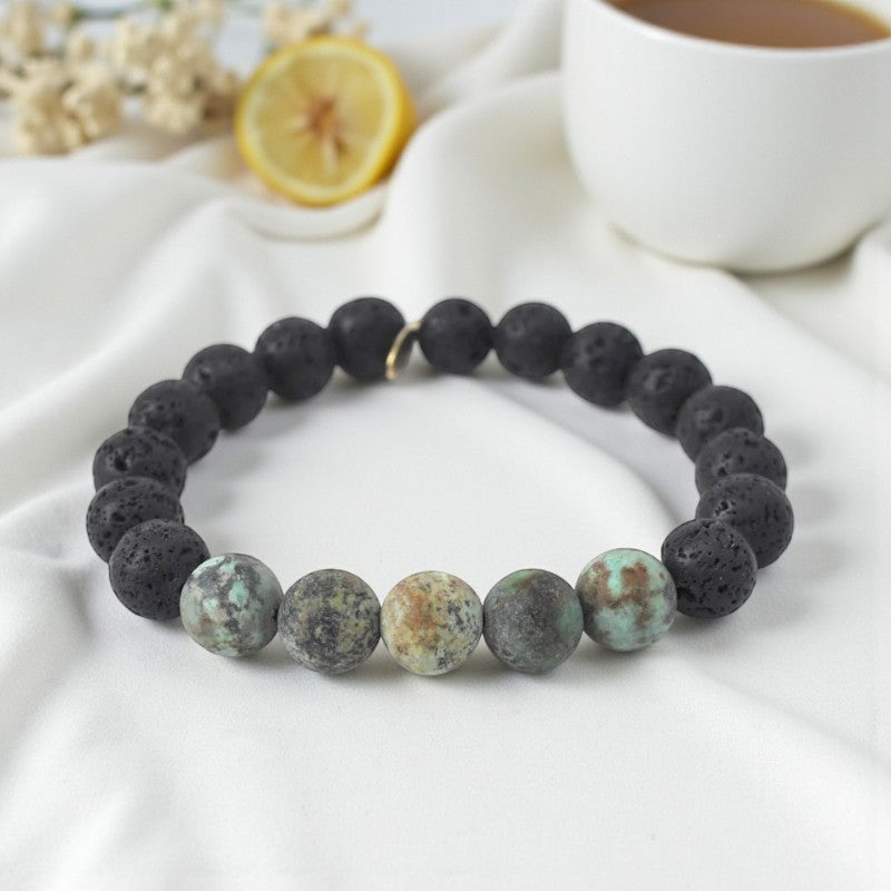 Embrace the harmonizing energies of the 10mm lava rock paired with five matte African turquoise beads in this exquisite bracelet. Each piece is crafted with care, featuring a natural gold Infinite Warrior charm and strung on a sturdy clear elastic cord.