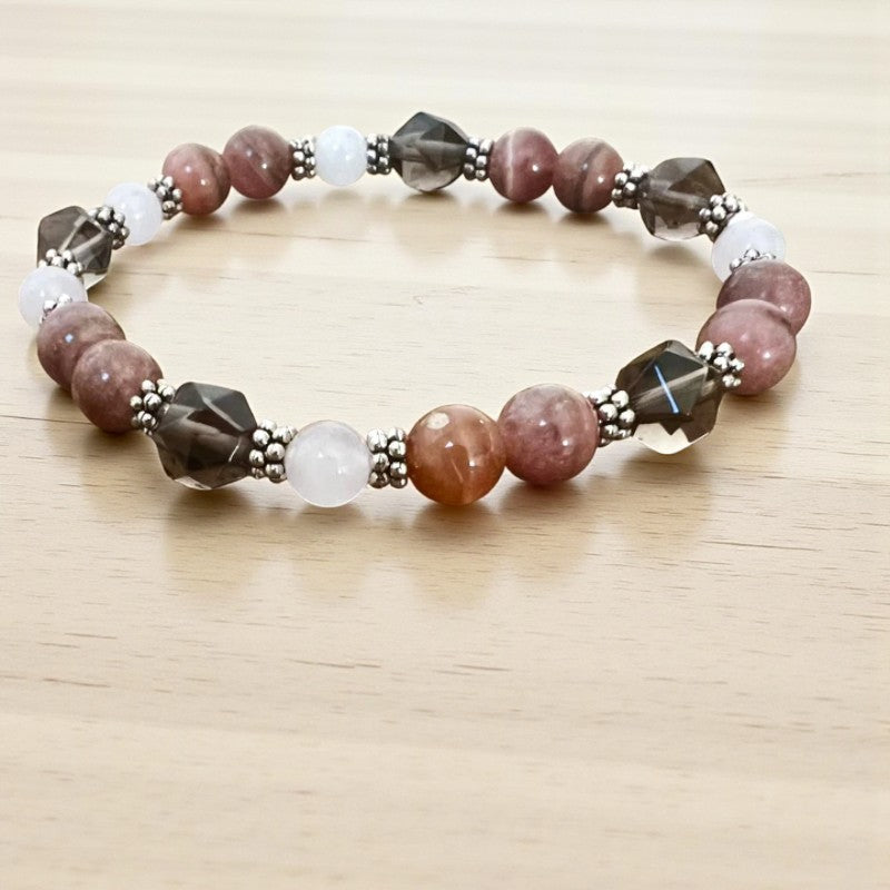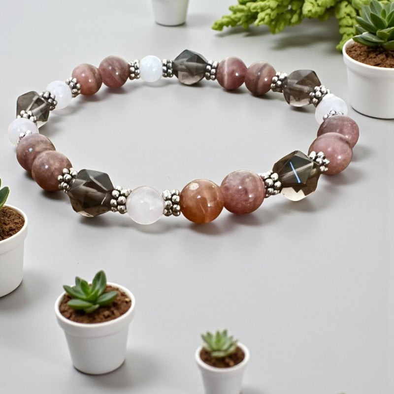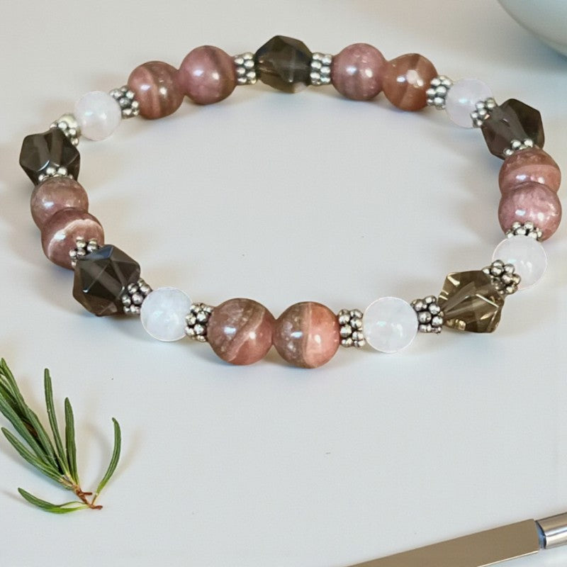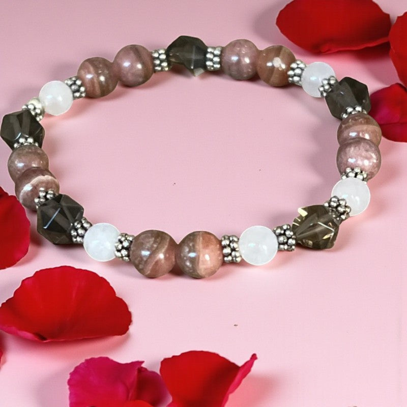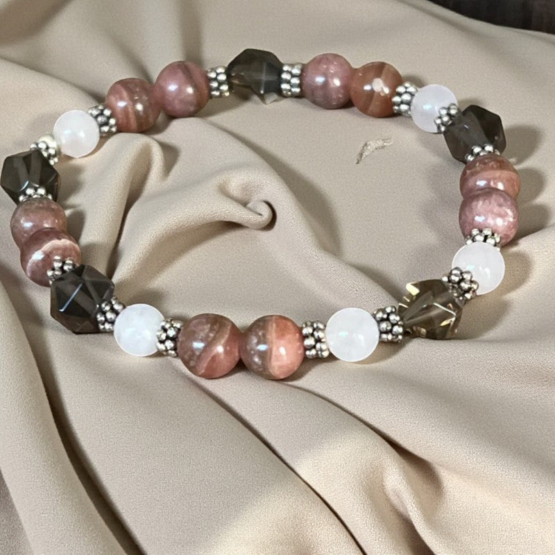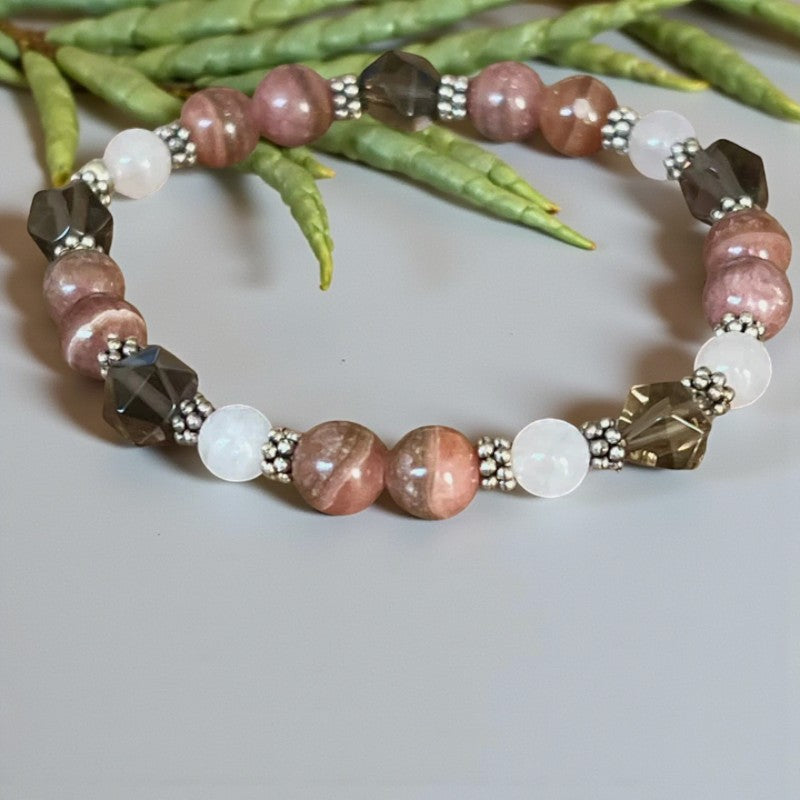 Love's Embrace: Rhodochrosite, Rose Quartz, Smoky Quartz, Silver Beaded Bracelet