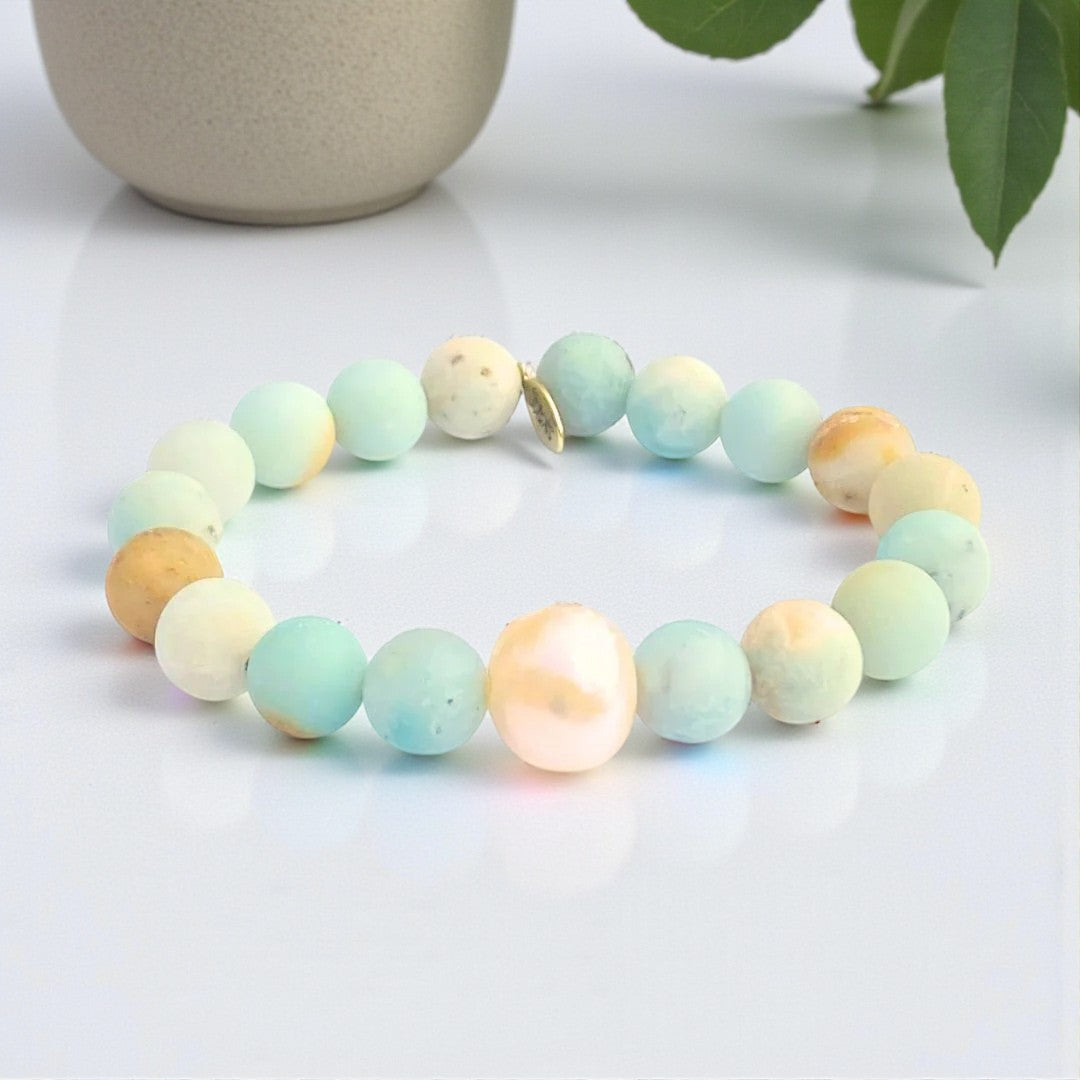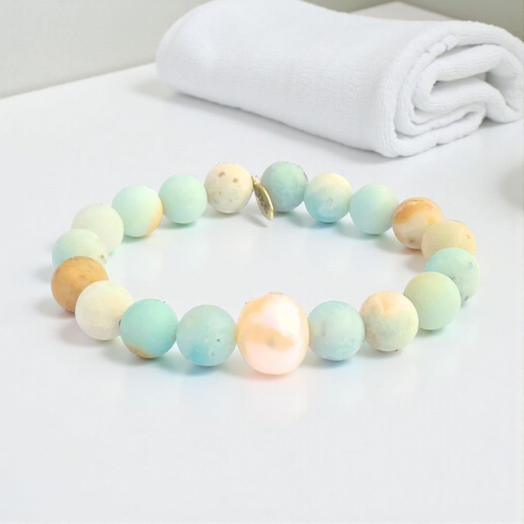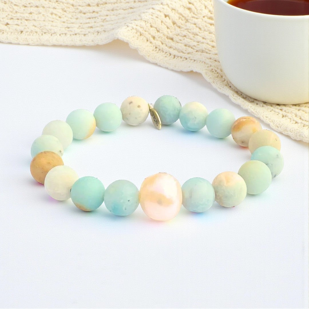 Embodying the tranquil essence of a beachscape, the Amazonite and Pearl Bracelet serves as a mental sanctuary, transporting you to a peaceful shoreline and alleviating stress-like feelings. This bracelet is a powerful ally in managing anxiety, quieting the mind, and dispelling consuming thoughts, empowering you to find inner balance and clarity amidst life's challenges.