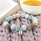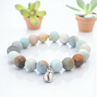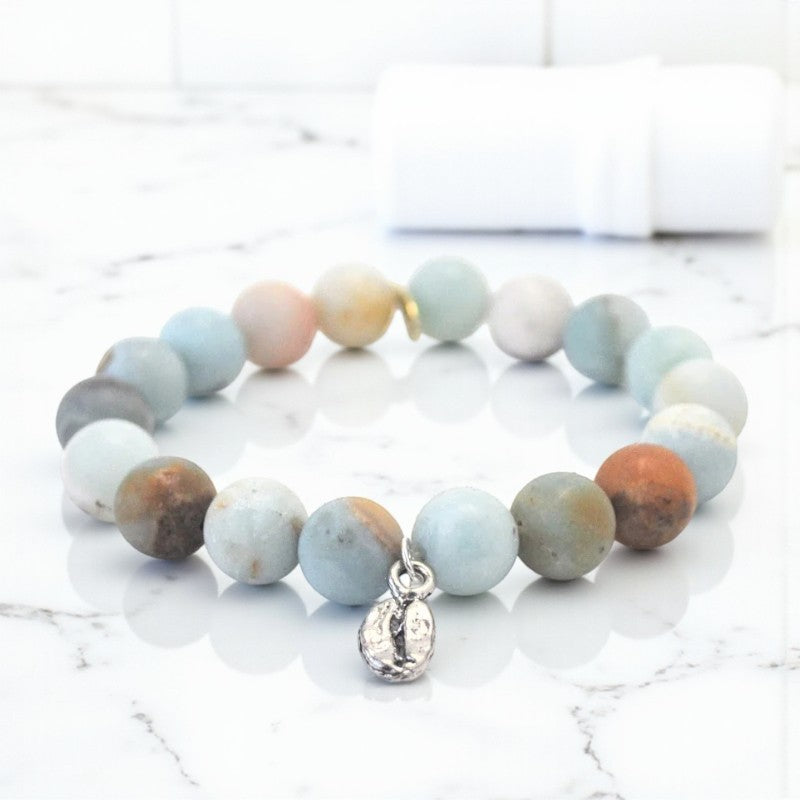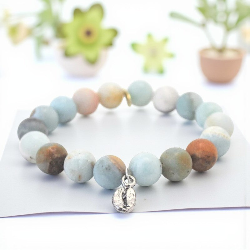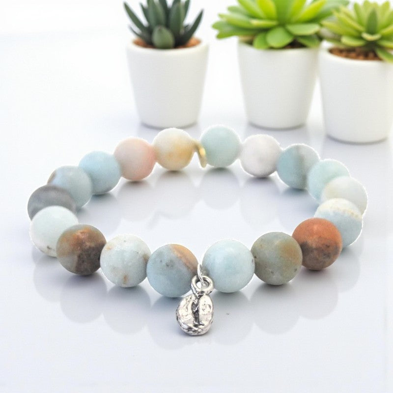 Embrace the soothing properties of the 10mm matte amazonite bracelet adorned with a silver coffee bean charm. Each bracelet is a unique piece crafted to bring balance and tranquility to your life. The average size is around 7 inches for women and 8 inches for men, strung on a durable clear elastic cord and finished with a natural gold Infinite Warrior charm.