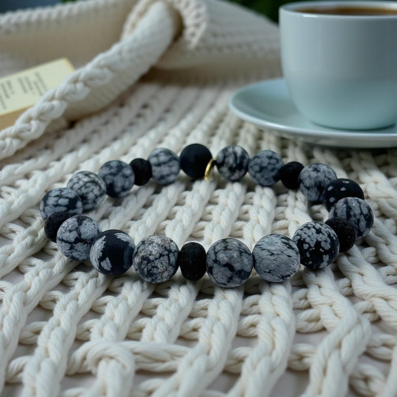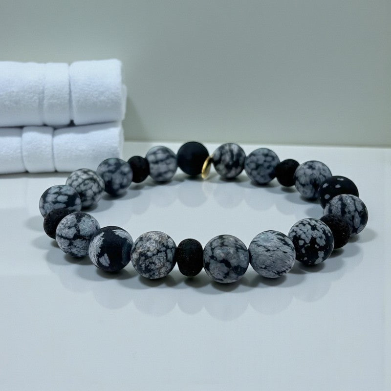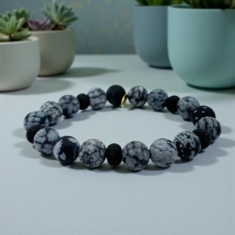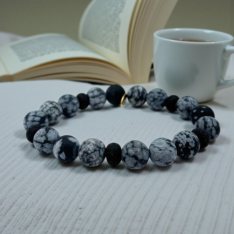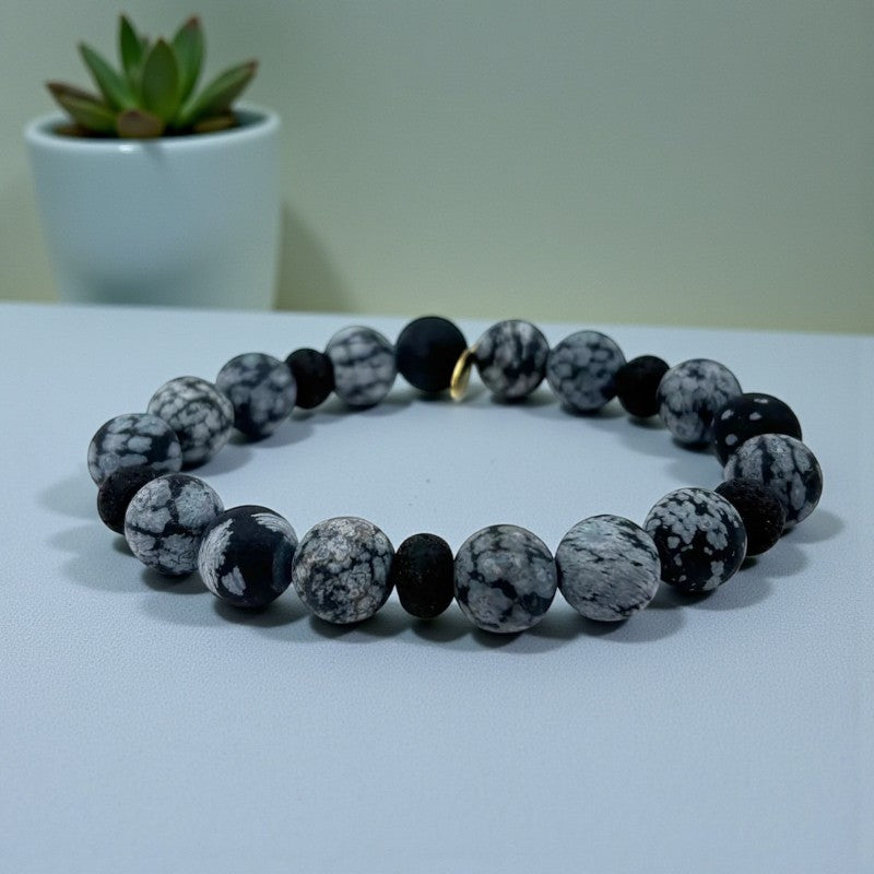 Matte Snowflake Obsidian Bracelet with Lava Accents: Natural Elegance