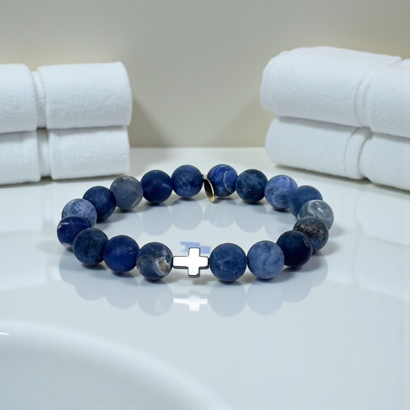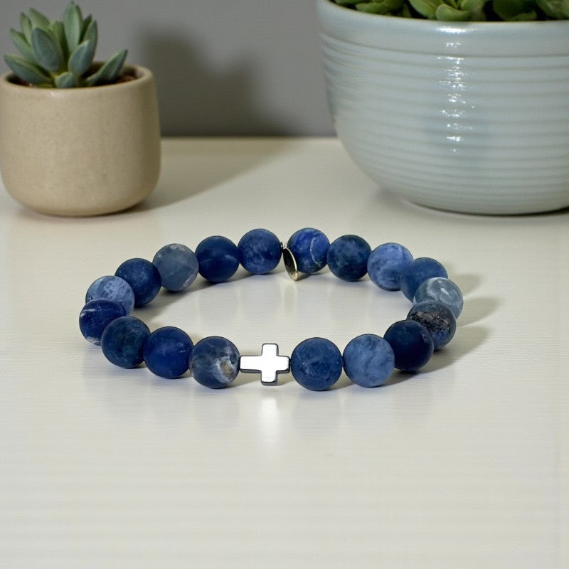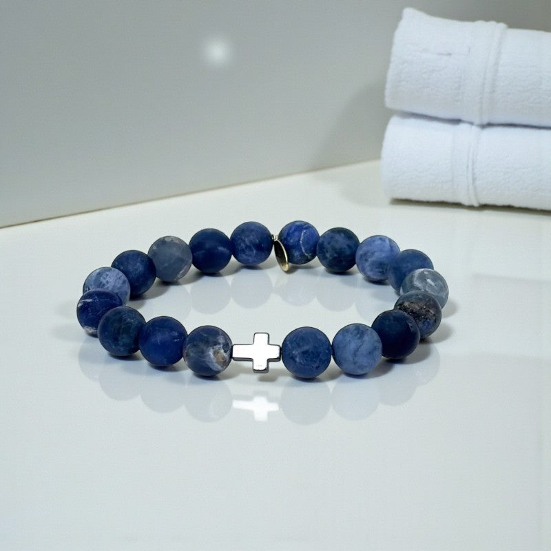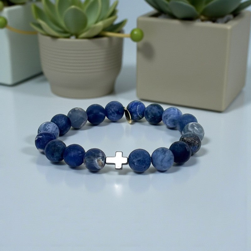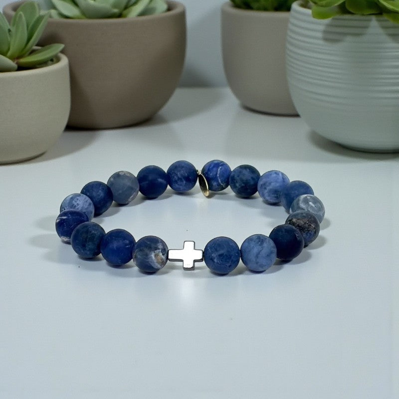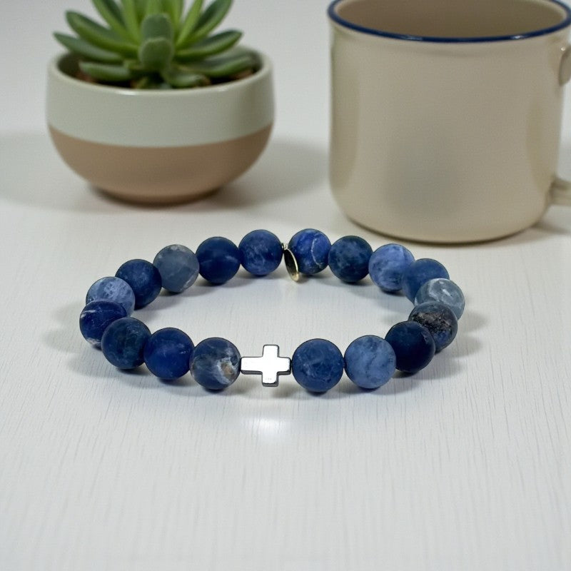Matte Sodalite Bracelet with Hematite Cross: Bold Elegance