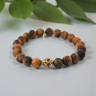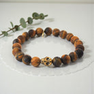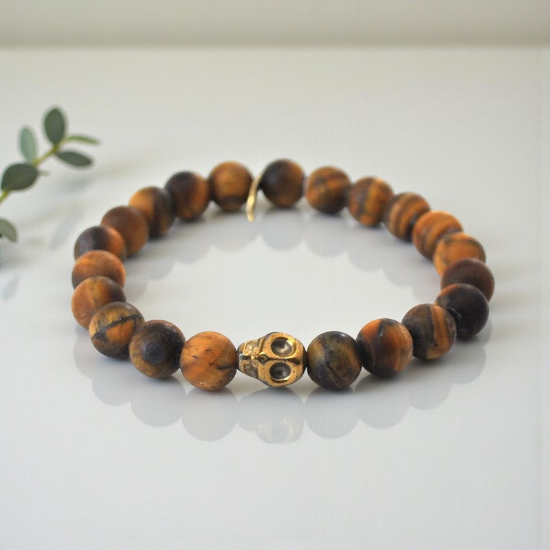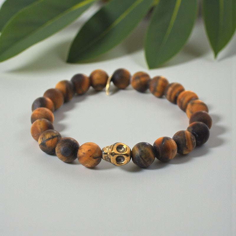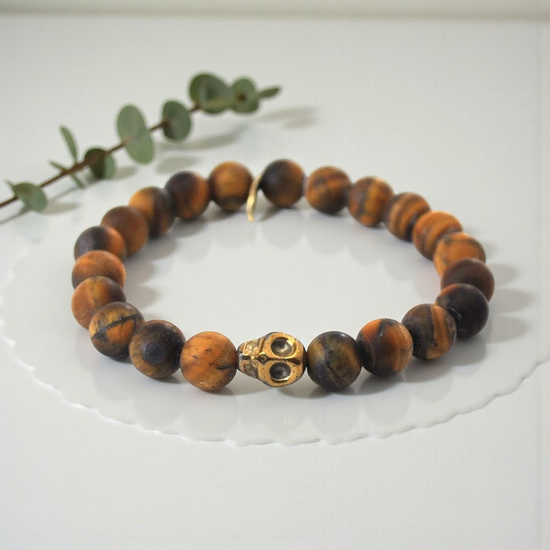 Matte Tiger Eye Bracelet with Gold Hematite Skull: Mystical Elegance