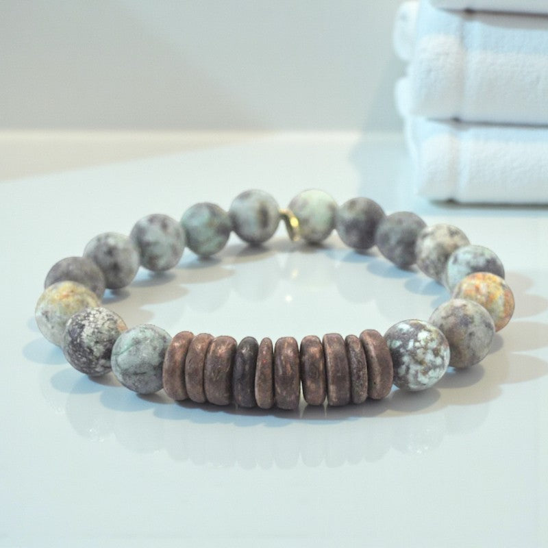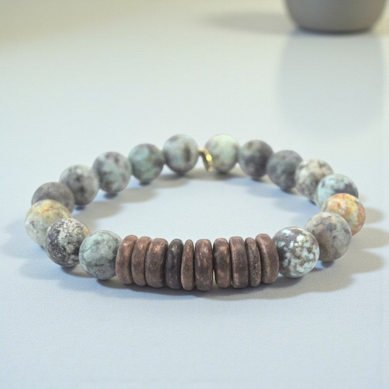 Discover the harmonious blend of purification, balance, and immunity with the African Turquoise and Coconut Heishi Bracelet. This exquisite accessory features 10mm matte African turquoise beads paired with coconut heishi rows, designed to resonate with the Heart, Throat, and Third Eye Chakras. Adorned with a natural gold Infinite Warrior charm, this bracelet embodies qualities such as protection, serenity, and positive energy, offering a holistic approach to well-being.