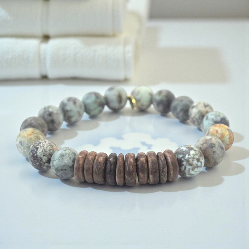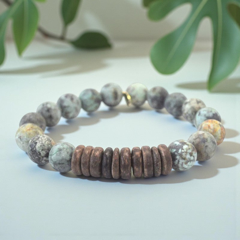 Let the African Turquoise and Coconut Heishi Bracelet be your companion in promoting purification, balance, and immunity. Embrace the soothing energies of African turquoise as it works to cleanse and protect your mind, body, and spirit. Allow this bracelet to be a symbol of positivity, wisdom, and inner balance as you journey through life with resilience and grace.