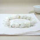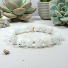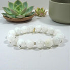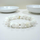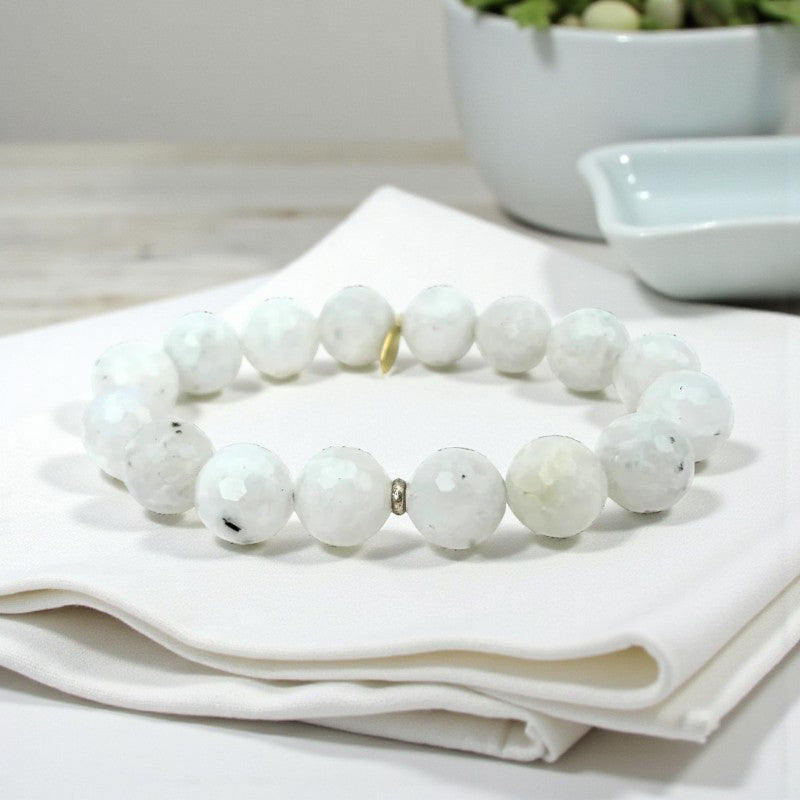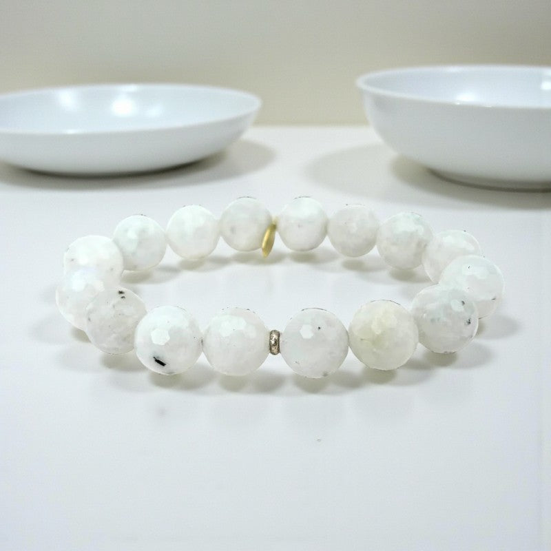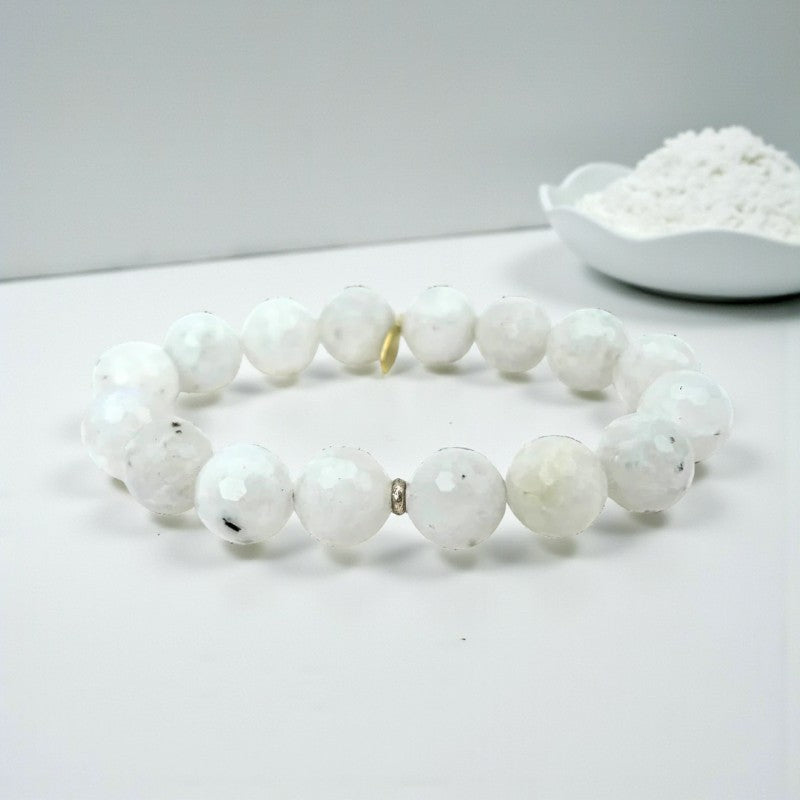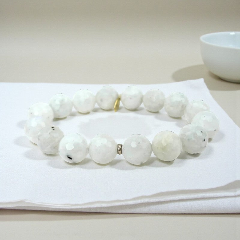 Embark on a journey of new beginnings and emotional balance with the Moonstone Bracelet, a symbol of fertility, inner strength, and spiritual insight. Crafted with 12mm faceted white moonstone beads and a sterling silver ring, this bracelet resonates with the Third Eye and Solar Plexus Chakras, offering support for happiness, love, success, and abundance. Adorned with a natural gold Infinite Warrior charm, this bracelet symbolizes inner strength, safe travels, and nurturing energies.