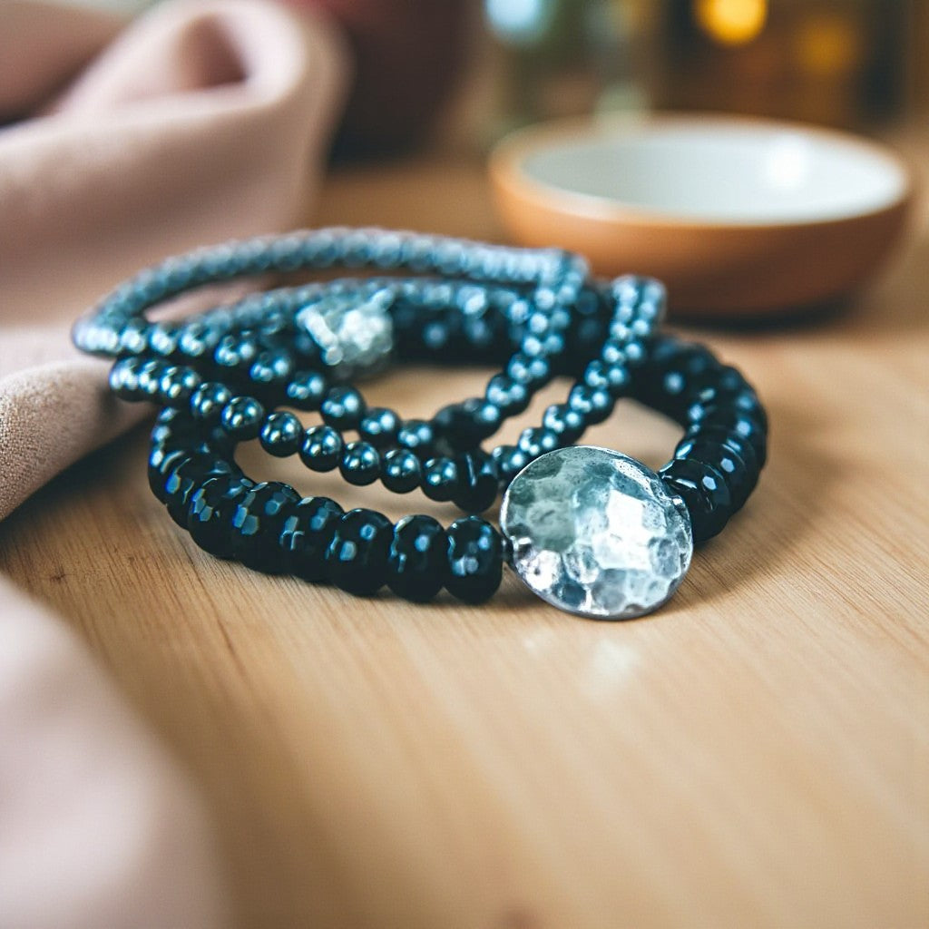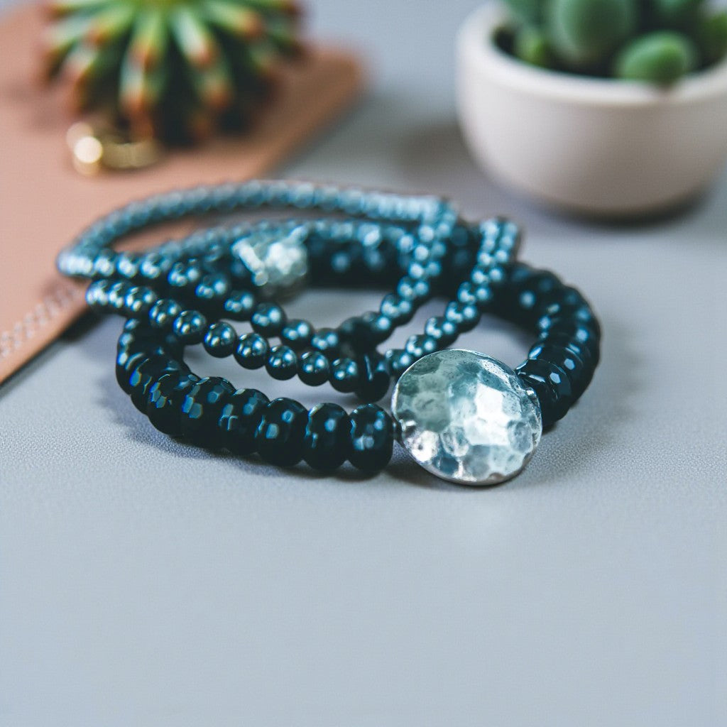 The remaining two bracelets showcase smooth, round hematite beads and black onyx accents, adding a touch of sophistication and charm to your ensemble.