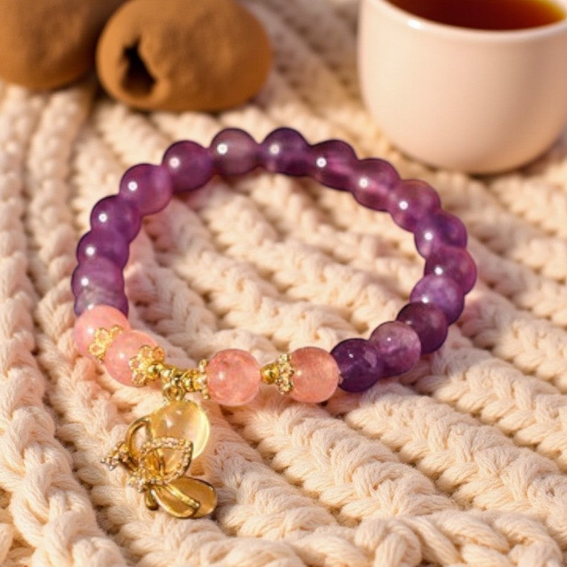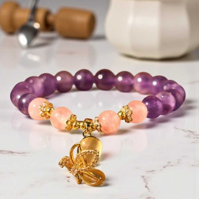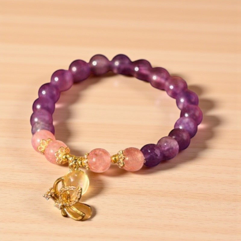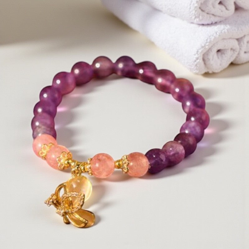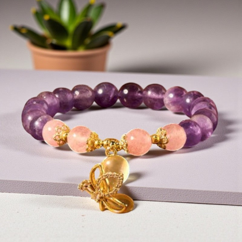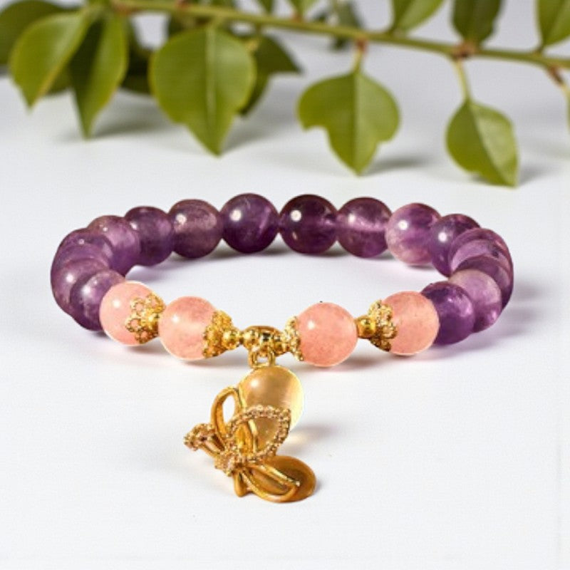Natural Amethyst Strawberry Quartz Crystal Healing Butterfly Charm Bracelet