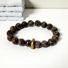 Unveil the transformative power of the 10mm brown snowflake obsidian bracelet adorned with a boho brass ring. Each bracelet is meticulously handcrafted with a natural gold Infinite Warrior charm and strung on a durable clear elastic cord, blending style with the potent healing properties of snowflake obsidian.