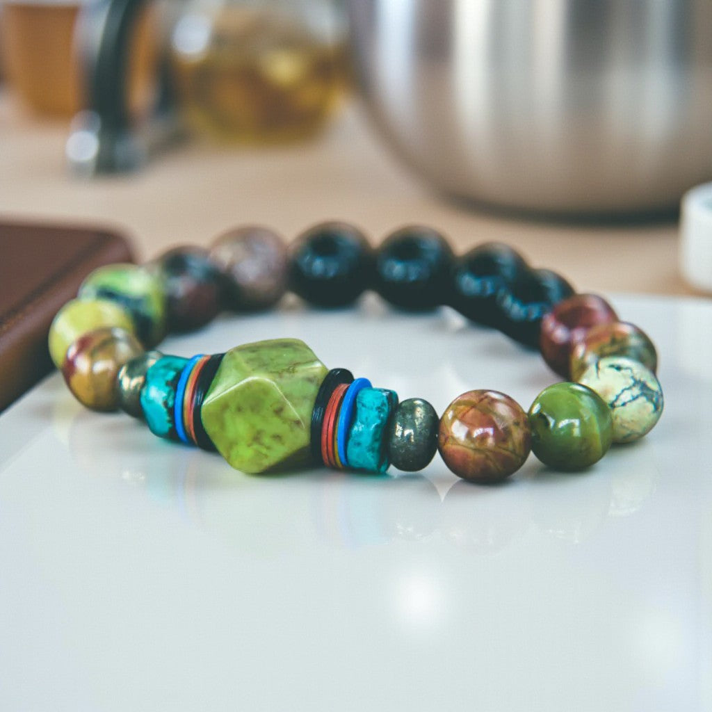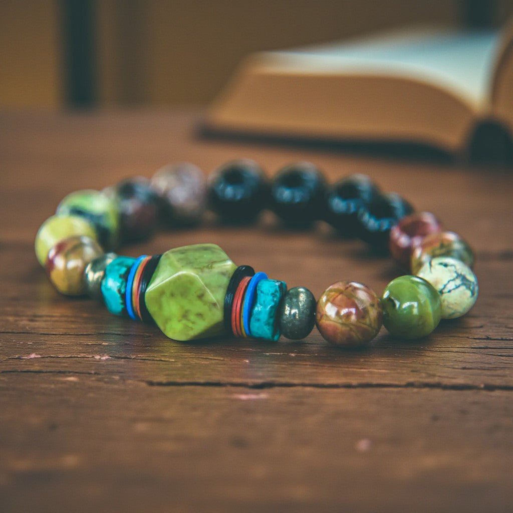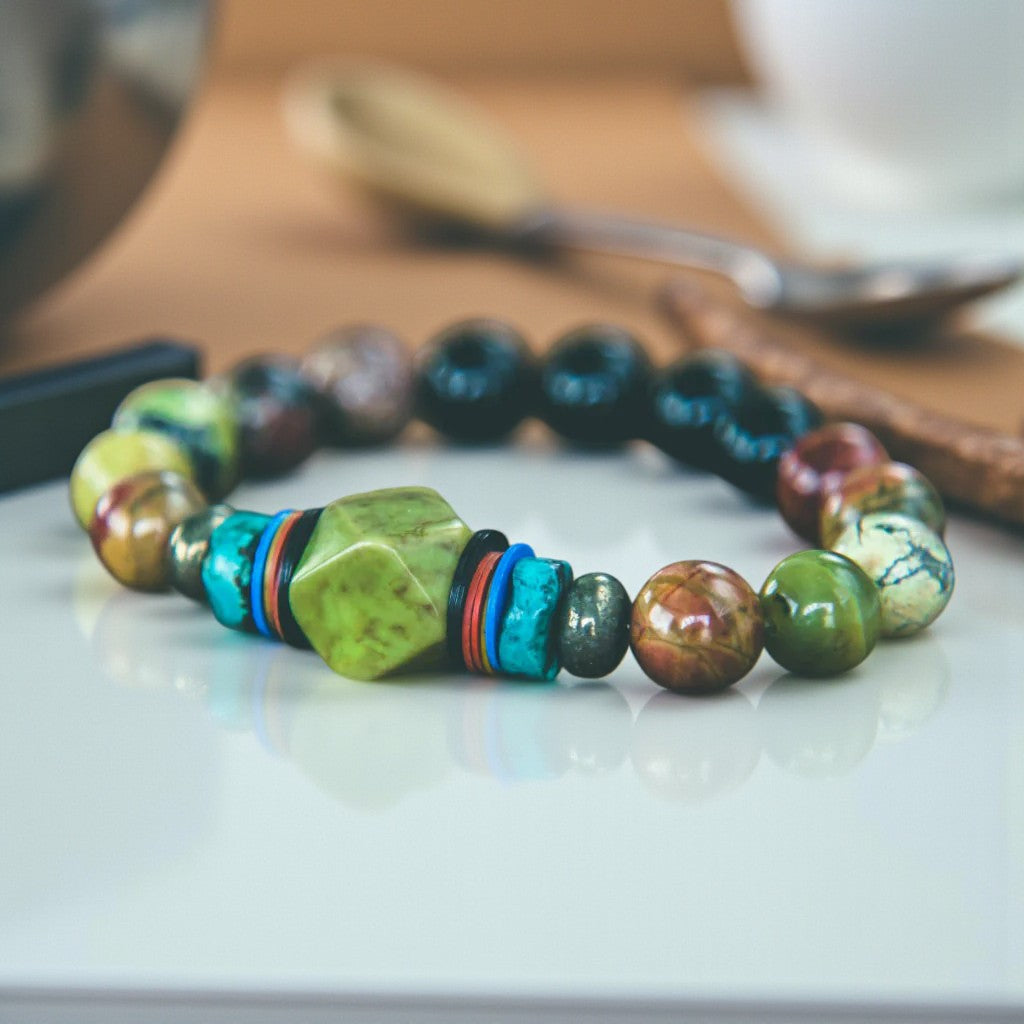 This exquisite piece of bohemian jewelry is crafted from natural gemstones, each a rare and unique treasure tailored for the beautiful woman or the dashing man within you. The stones are artfully intertwined, boasting earthy hues that mirror the elements of sky, earth, water, and lush greenery - a harmonious symphony created for your sheer delight.