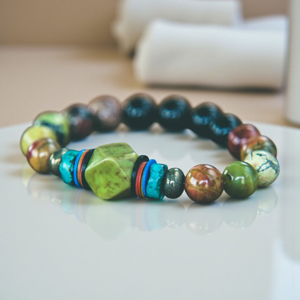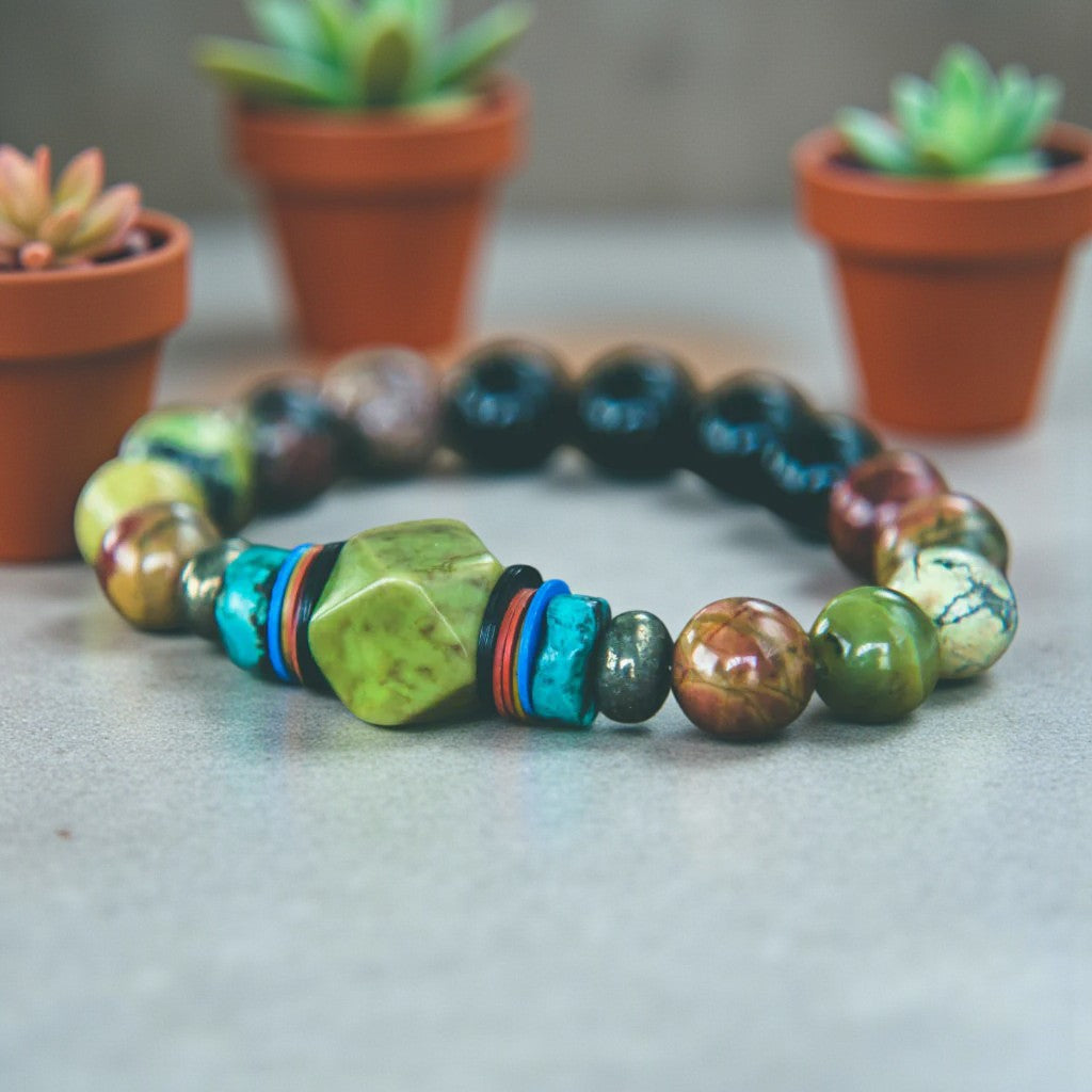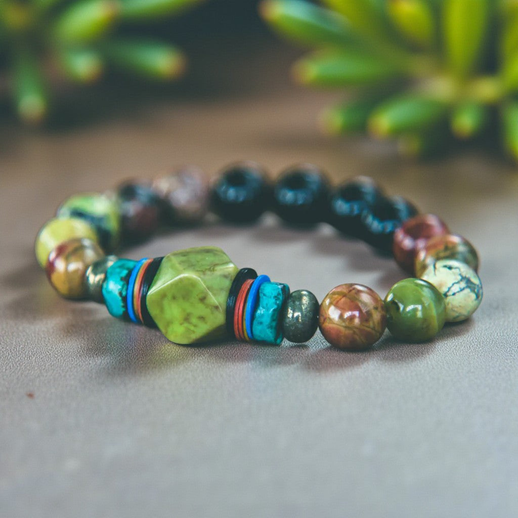 At the heart of the Tree Hugger Bohemian Earth Bracelet lies a stunning avocado turquoise, a revered stone renowned for its protective energies and its ability to align and harmonize the chakras. Adorned with vintage record vinyl spacers, heishi turquoise, pyrite, yellow turquoise, red creek jasper, and black onyx, this bracelet weaves a tale of powerful energies and positive vibrations. Pyrite dispels confusion, illuminates pathways, and inspires decisive action, while red creek jasper acts as the ultimate guardian, absorbing negativity and realigning chakras with positivity. Black onyx serves to ground, balance, and ward off negativity, fostering enhanced concentration and welcoming in positive energies.