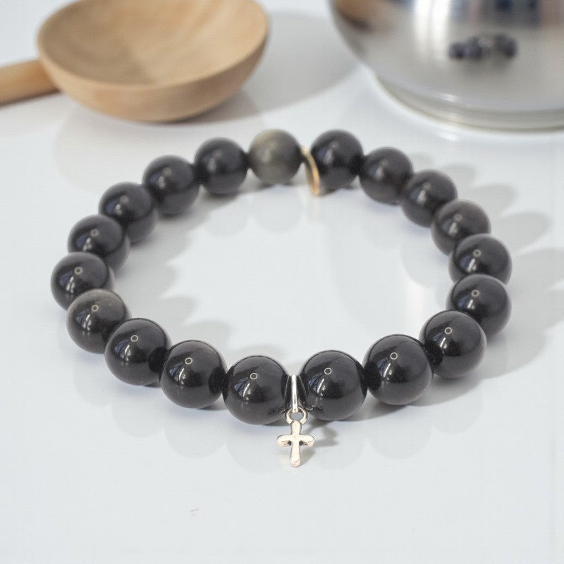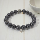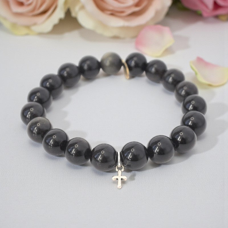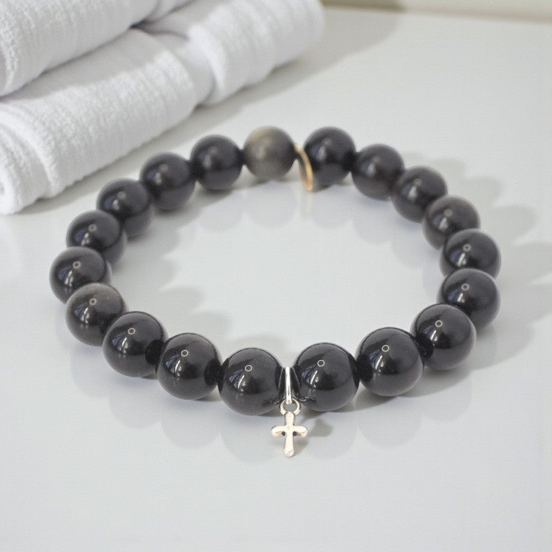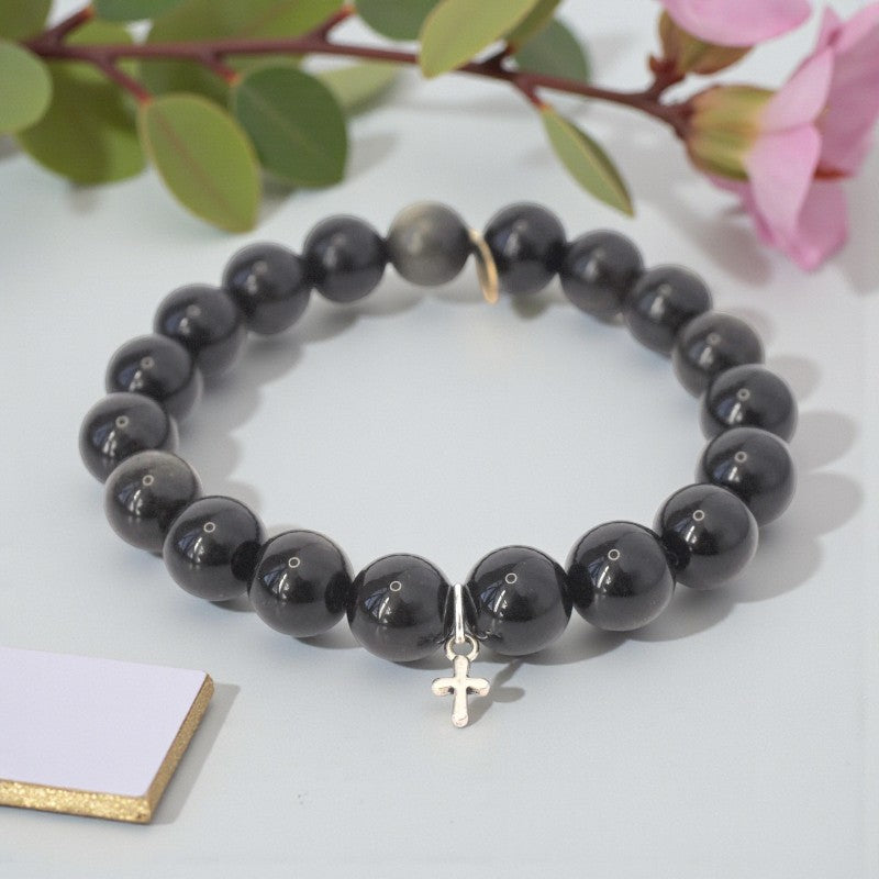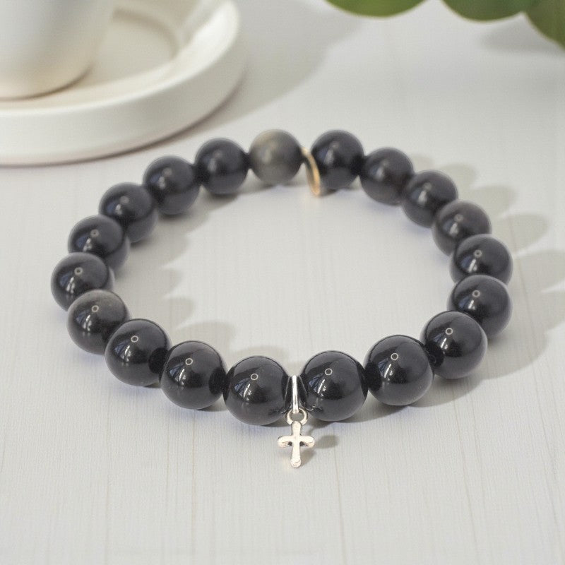 Obsidian Crystal Bracelet with Silver Cross Accent