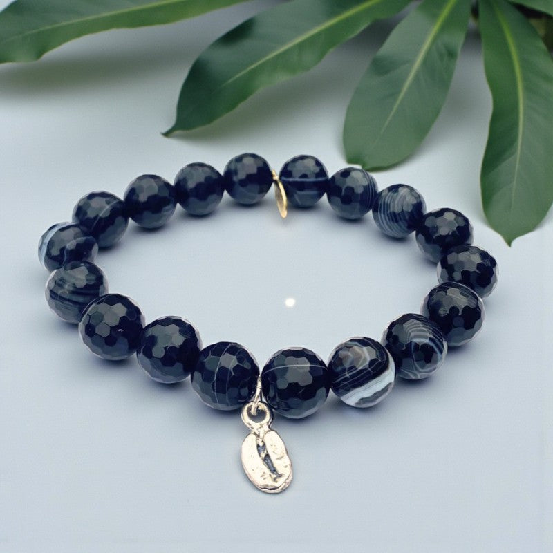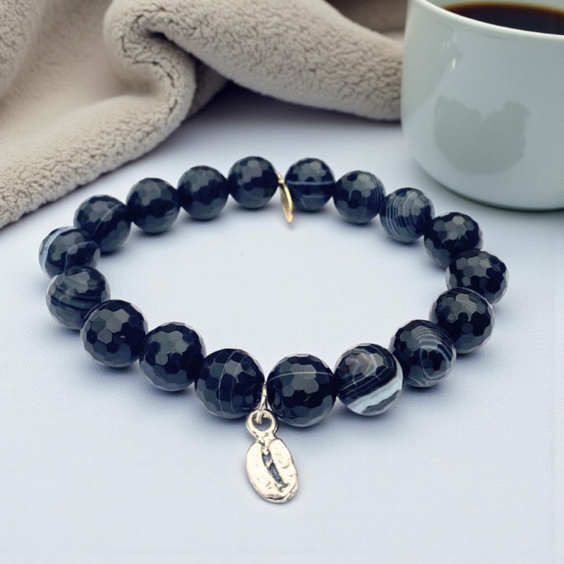 Step into a realm of inner power and resilience with the Black Onyx Bracelet featuring a charming silver coffee bean charm, a symbol of strength, discipline, and empowerment. Handcrafted with faceted 10mm black onyx beads and adorned with a natural silver coffee bean charm, this bracelet embodies qualities of stamina, vigor, and self-control, offering a sense of grounding and stability to those who wear it.