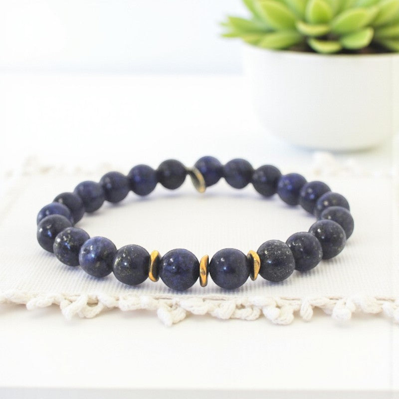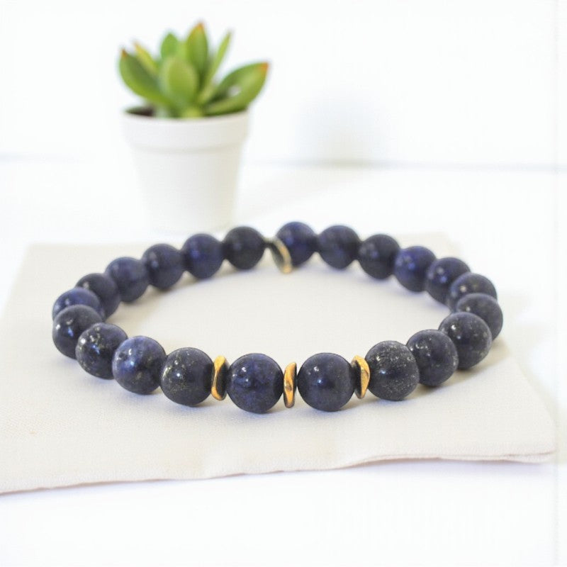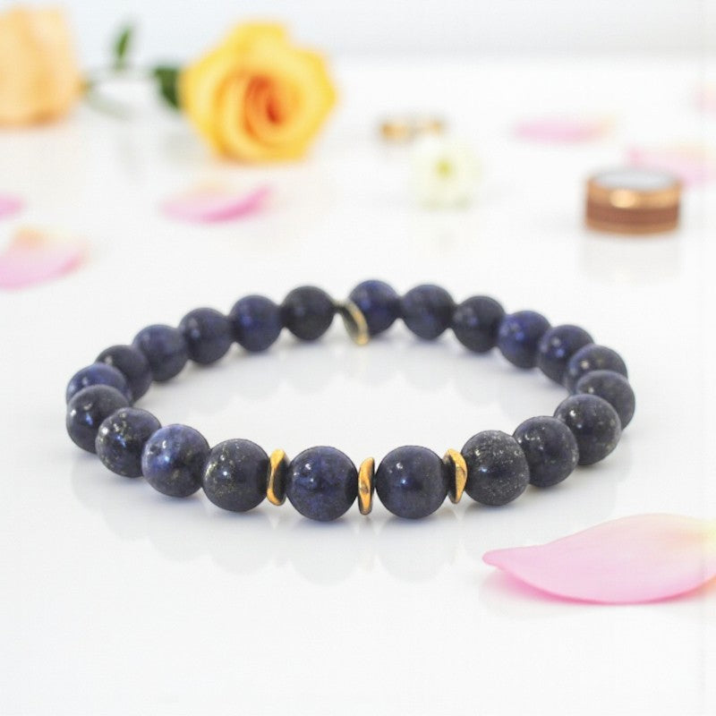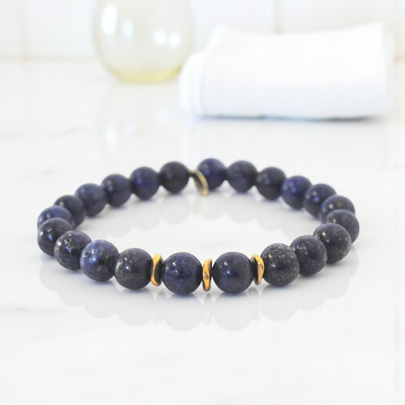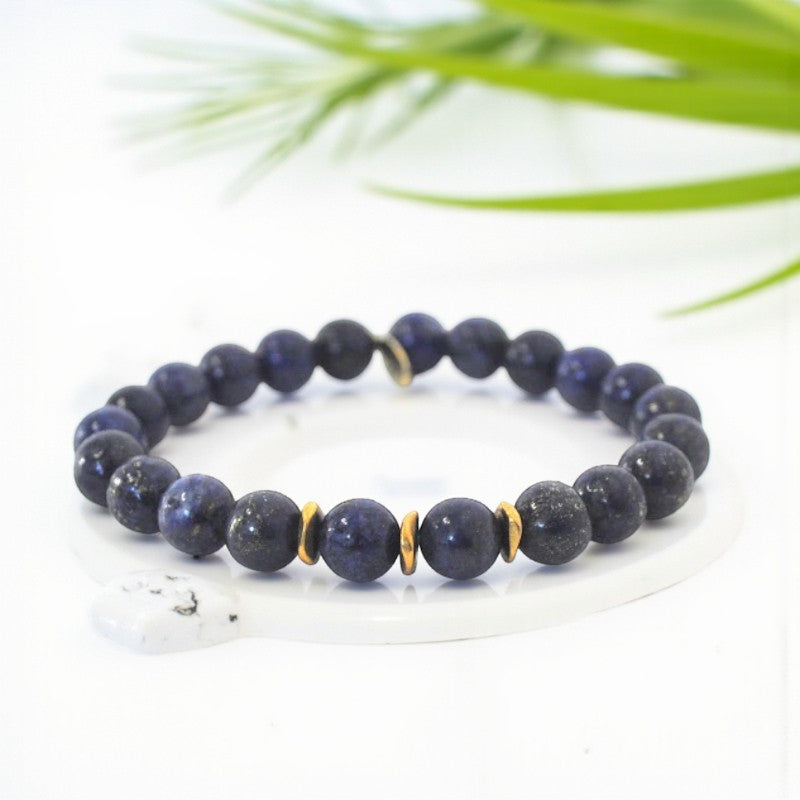 Distinguished by its deep blue hue and shimmering golden flecks of pyrite, Lapis Lazuli is a stone of protection and inner peace. Whether worn by men or women, this bracelet radiates compassion and provides a safe space for authentic emotional expression.