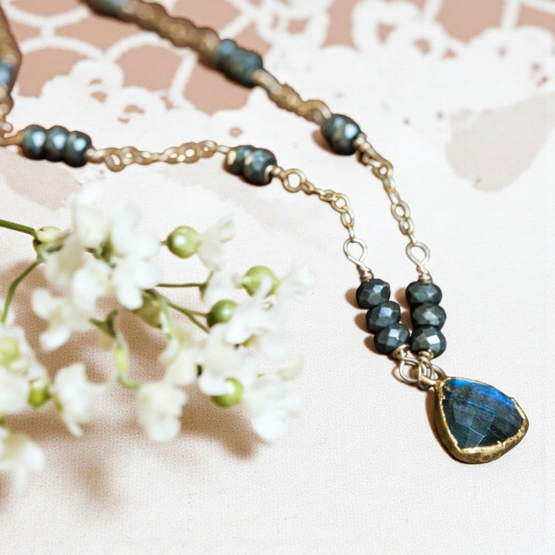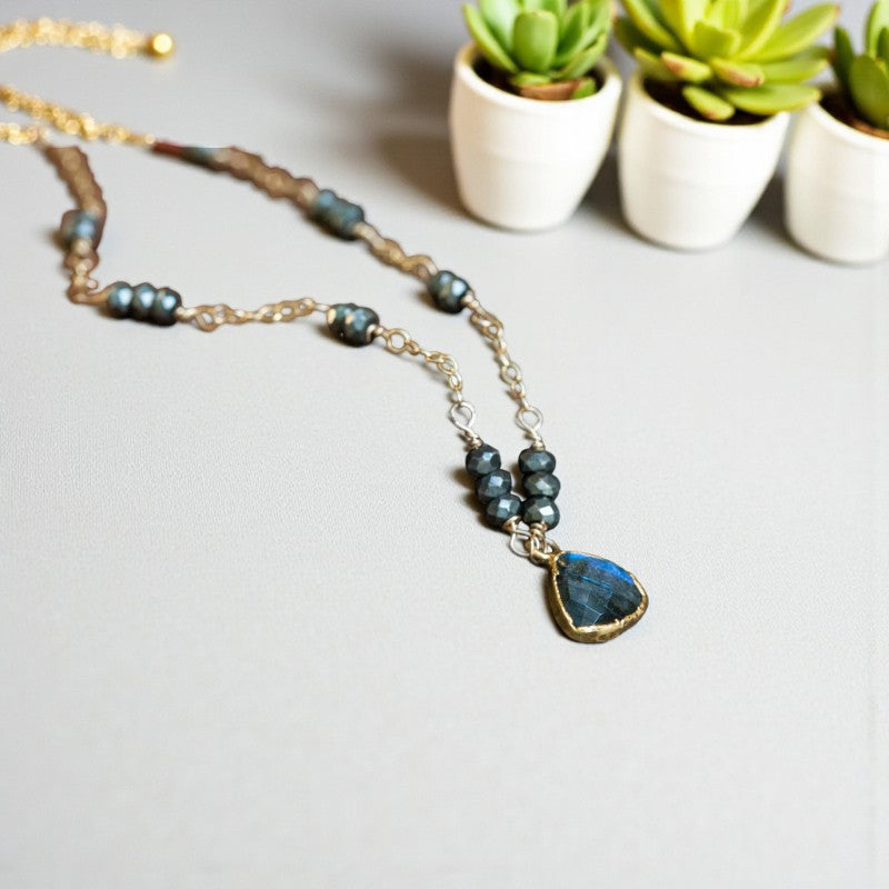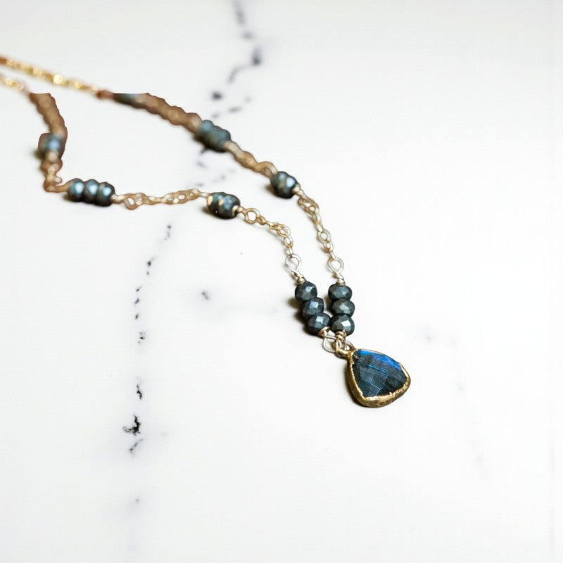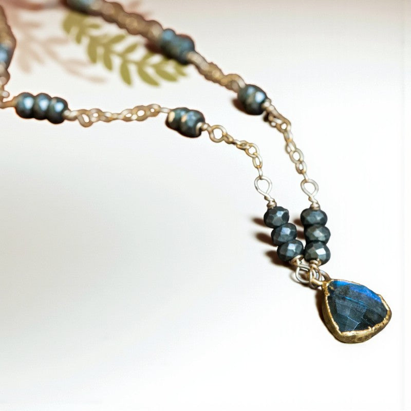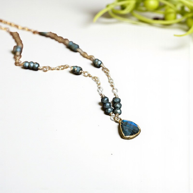 This necklace is a testament to unique and meaningful jewelry, featuring a gold-filled chain adorned with a faceted Labradorite connector set in gold for added allure. Interspersed with faceted Pyrite accents, the chain exudes a stunning aesthetic, as the metallic luster of Pyrite harmonizes with the shimmering glow of Labradorite.