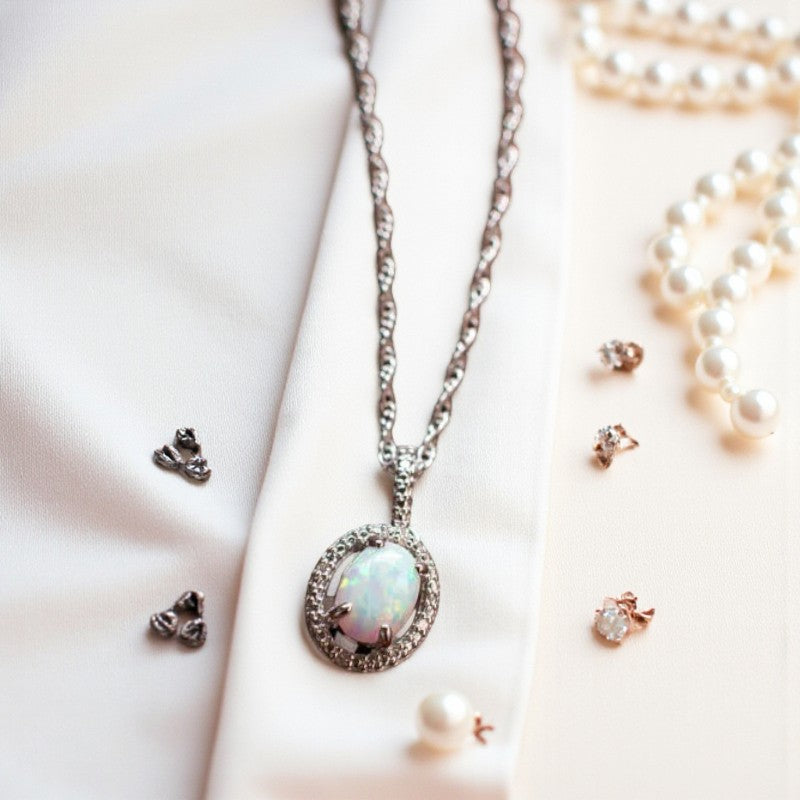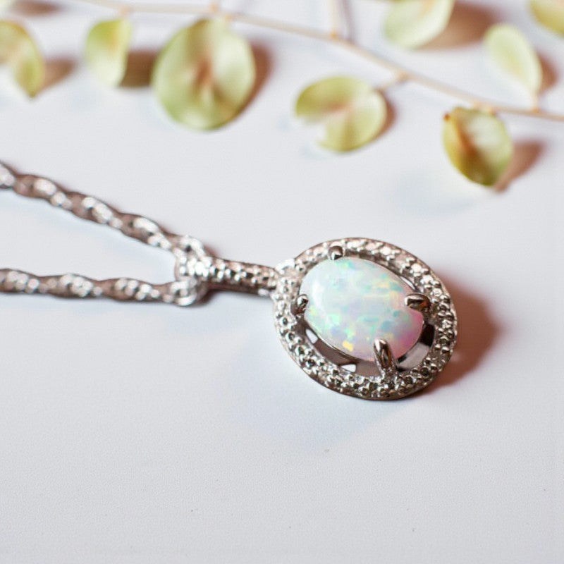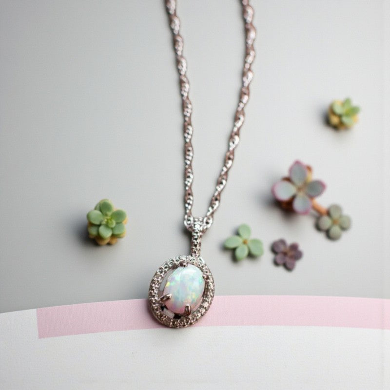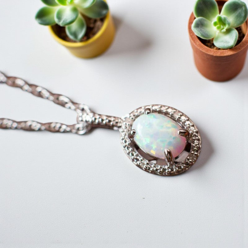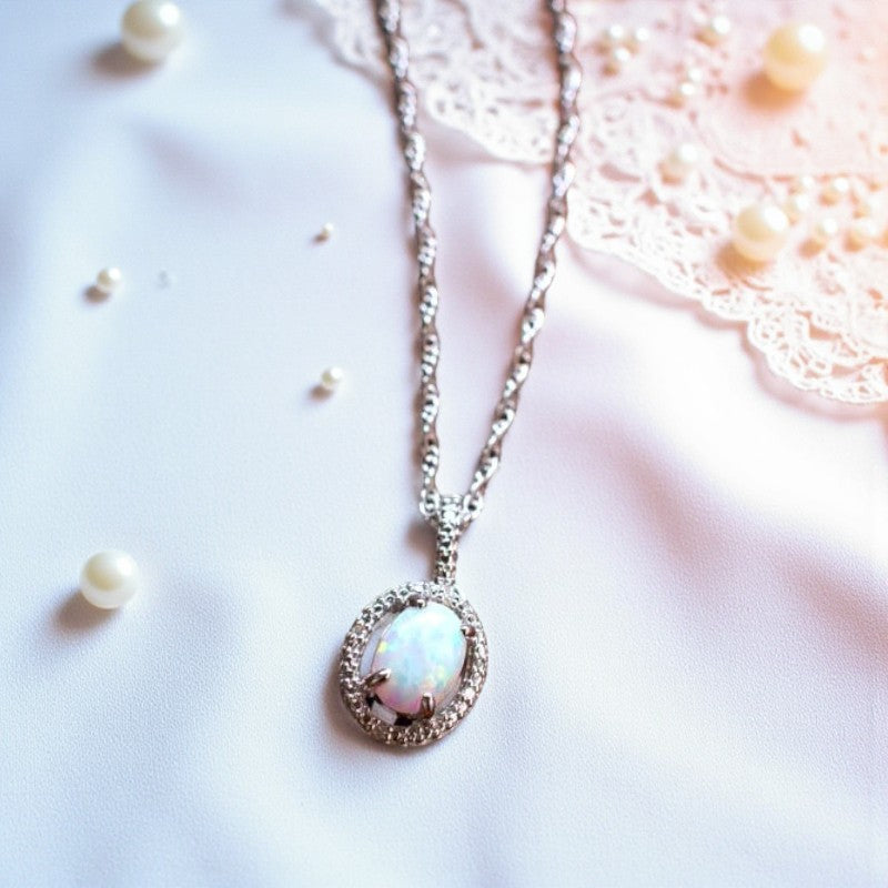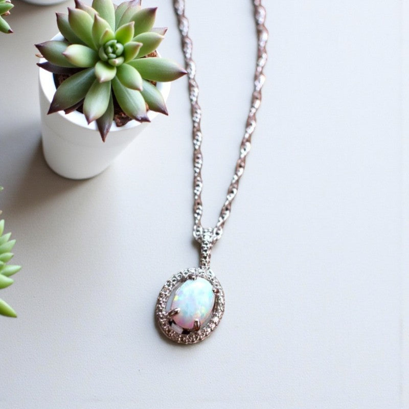 Opal's soothing presence calms the spirit, dispelling anger and stress to make way for emotions of love, passion, desire, and loyalty. This radiant gem enhances vision and memory, unveiling the passionate depths within individuals. Adorned with a dainty sterling silver chain, the opal takes center stage, embraced by fiery diamonds that enhance its ethereal allure, creating a vision of timeless elegance and grace.