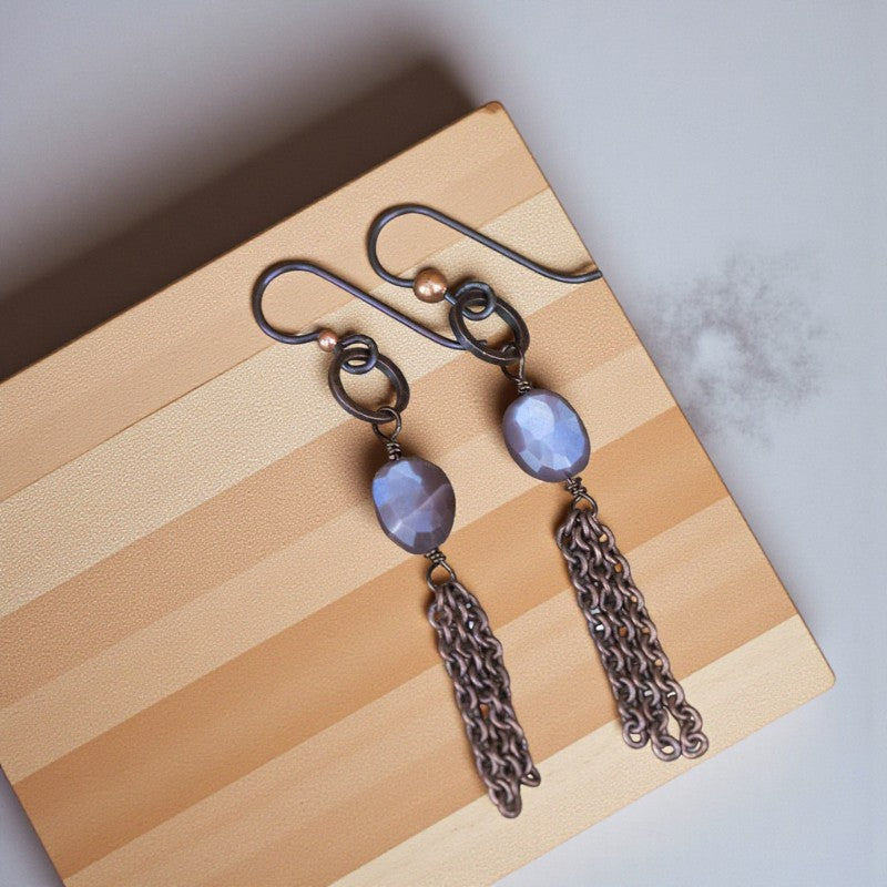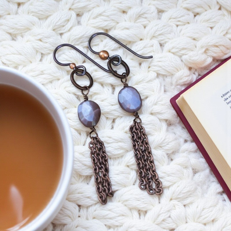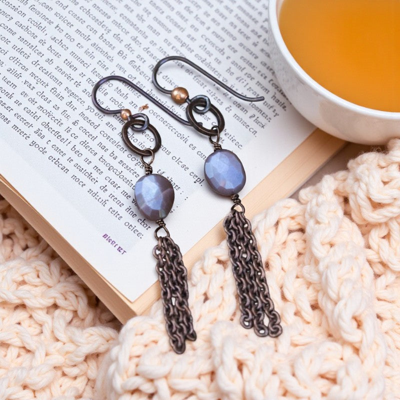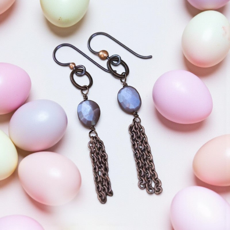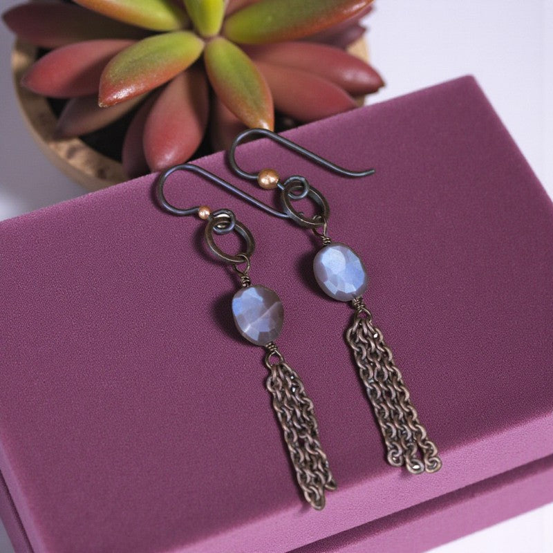 Finishing the exquisite design is a lightweight French ball ear wire adorned with a rose gold bead, imparting a subtle touch of refinement and enhancing the earrings' allure. The interplay of rose gold against antique brass, coupled with the peachy luminescence of the moonstone, creates a harmonious aesthetic that is simultaneously earthy and sophisticated. Despite their intricate detailing, these earrings retain a feather-light quality, ensuring all-day comfort. The gentle sway of the dangling chains adds a hint of mystique and whimsy to your ensemble.