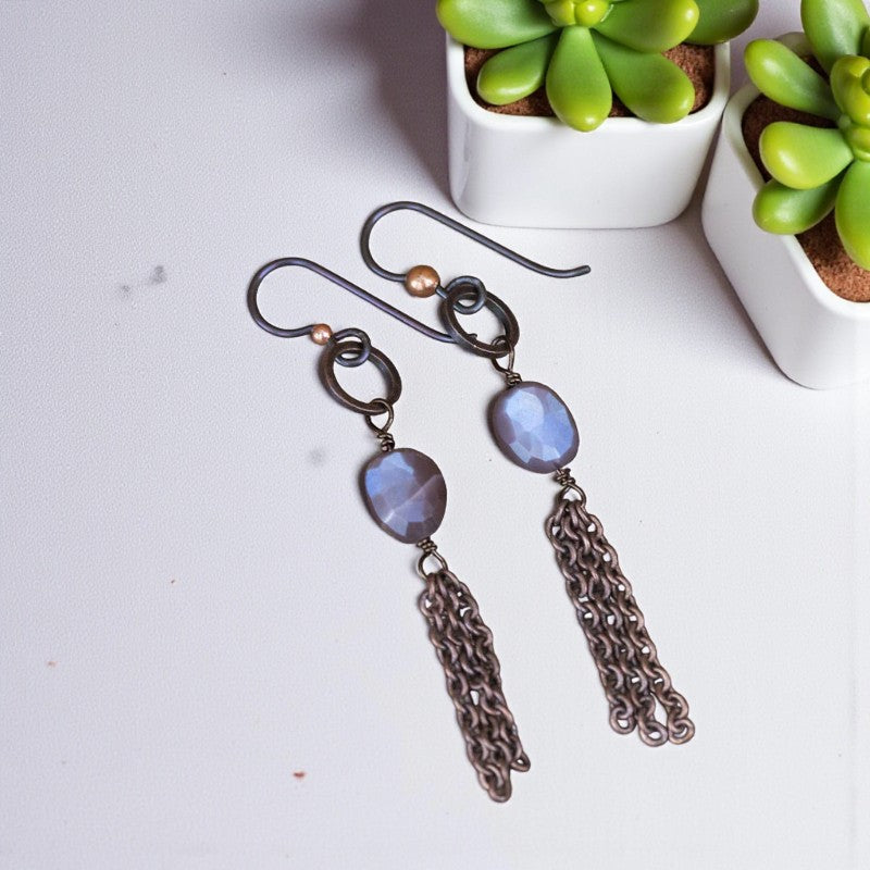 Above the gemstone, an antique brass circular embellishment imparts a vintage allure to these earrings, infusing them with a timeless elegance. Symbolizing completeness and unity, the circle enhances the earrings' spiritual essence, anchoring the calming attributes of the moonstone. Below each moonstone, three individual antique brass chains sway gracefully, imparting a subtle movement with every step. Meticulously spaced and artfully crafted, these chains exude an organic aesthetic, forging a connection between the wearer and the grounding energies of the earth.