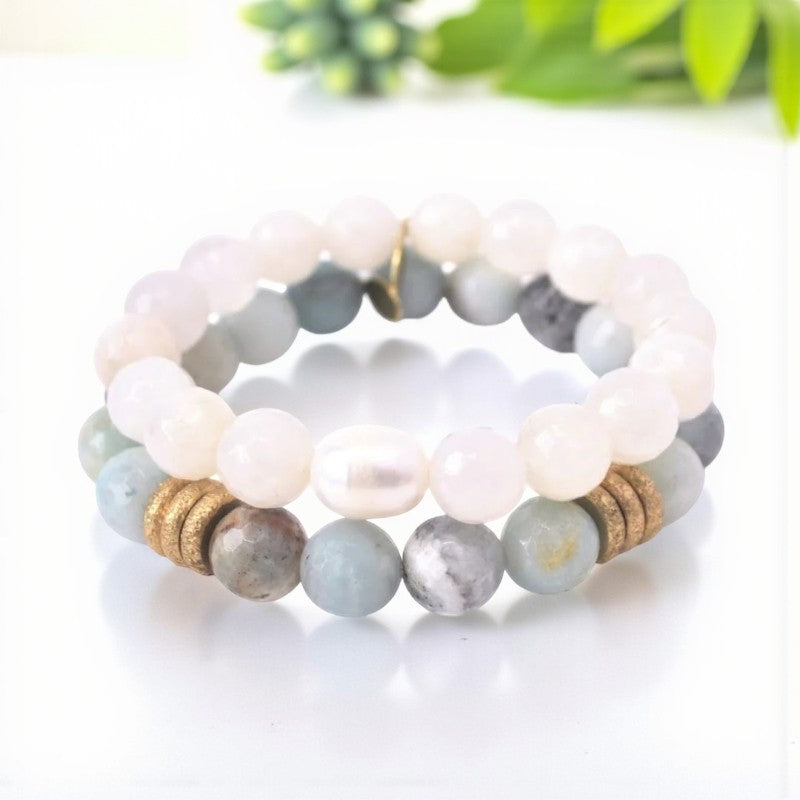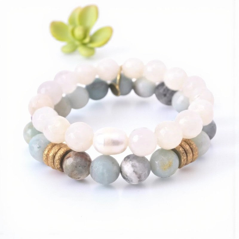 Experience a harmonious blend of energies with the captivating combination of the 10mm faceted White Moonstone bracelet adorned with a pearl and the 10mm Amazonite bracelet featuring six brushed gold rings. This exquisite set is tailored for those born in June and influenced by the zodiac signs Cancer, Libra, Scorpio, and Virgo, offering a diverse range of healing properties associated with Moonstone and Amazonite crystals.