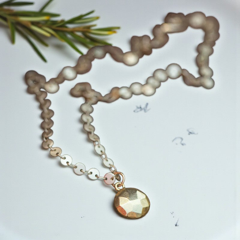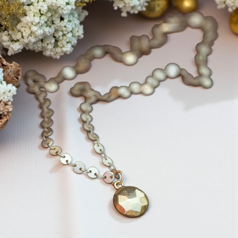 Crafted entirely from sumptuous gold, this necklace features a textured circular disc at its core, reminiscent of a dime in size. The versatility of the central piece is unmatched—it strikes the perfect balance, neither overpowering a casual look nor fading into the background of a glamorous ensemble. The quintessential chain, adorned with gold discs that glisten like sequins, captivates onlookers with its mesmerizing display.