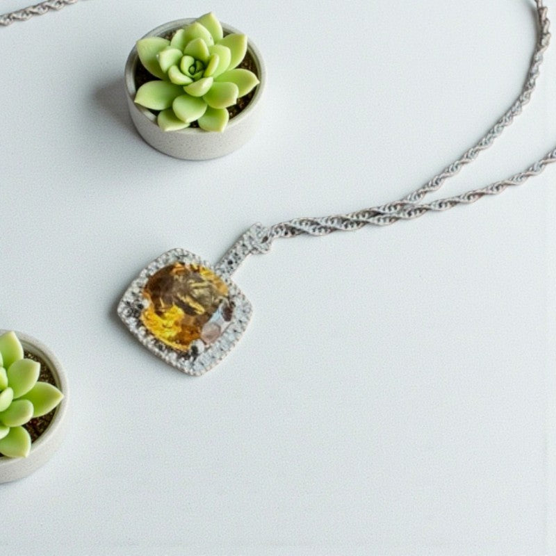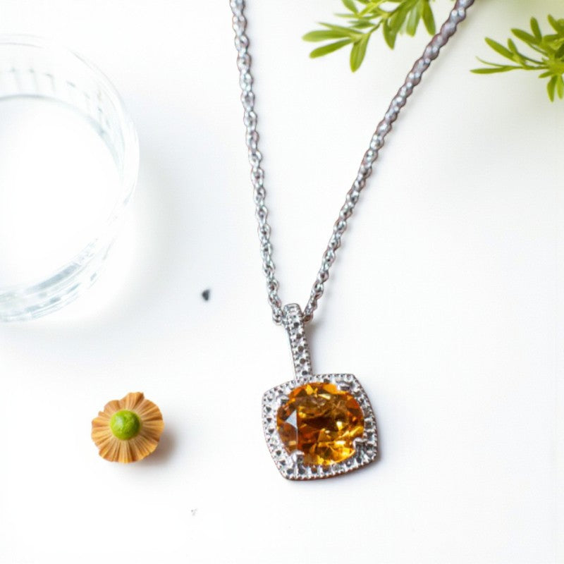 Radiant Splendor: Natural Citrine & Diamond Halo Necklace