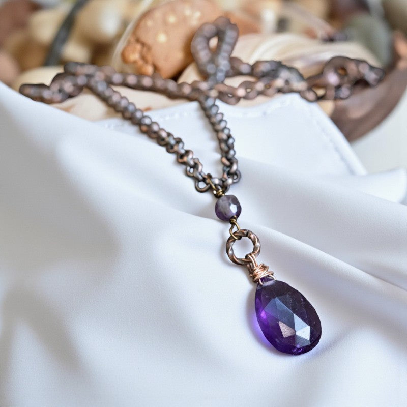 With a commitment to showcasing the stones in all their glory, the amethyst is delicately wrapped in rose gold wire, elevating its allure and intrinsic value. An antique copper accent piece delicately bridges the two stones, adding a touch of vintage charm to the design.