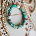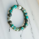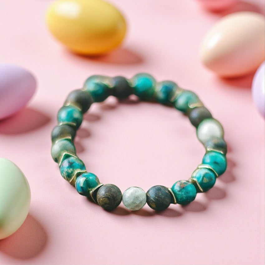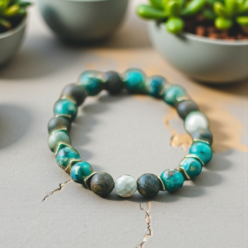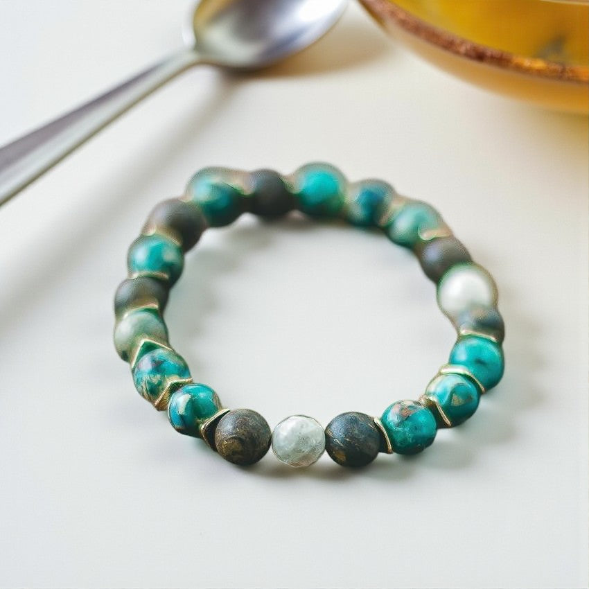 Ready to welcome change and revitalize your life? Look no further than our captivating blue-green snakeskin jasper and opalite bracelet. The unique appearance of blue-green jasper leaves a lasting impression, complemented by faceted river stones that echo the dark hues of the jasper. Opalite accents add a touch of charm, but it's the dazzling gold accent pieces that truly elevate this creation to a showstopper.