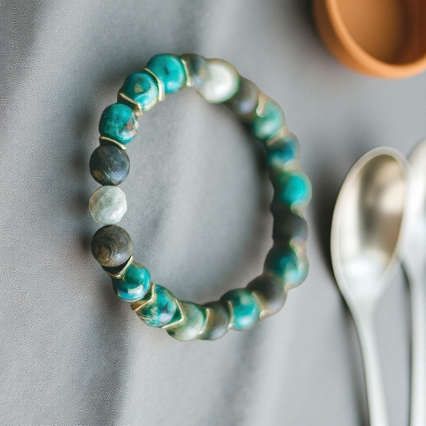 The varied shades of green, blue, and earthy tones infuse this bracelet with a sense of elegance and sophistication.