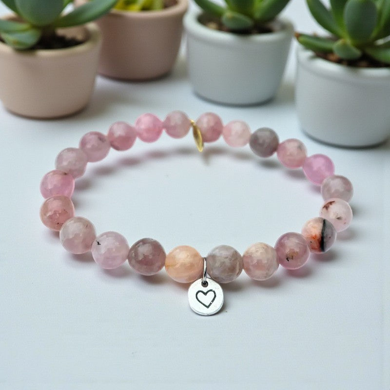 Embodying qualities of self-trust and forgiveness, rose quartz serves as a catalyst for personal growth and emotional healing, allowing individuals to embrace self-acceptance and nurture a sense of inner peace. By wearing the Madagascar Rose Quartz and Sterling Silver Heart Charm bracelet or keeping this stone within one foot of you, you open yourself to a path of self-discovery and emotional transformation.