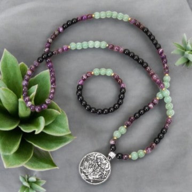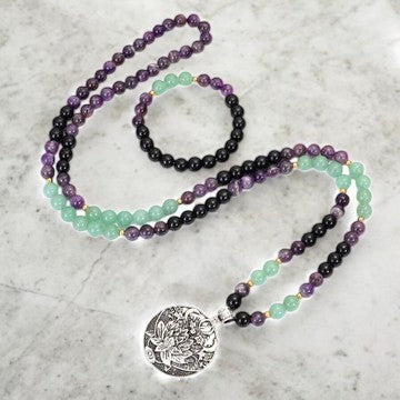 "The Tranquil Haven: 108 Mala Beads Amethyst Green Aventurine Lotus Meditation Bracelet"