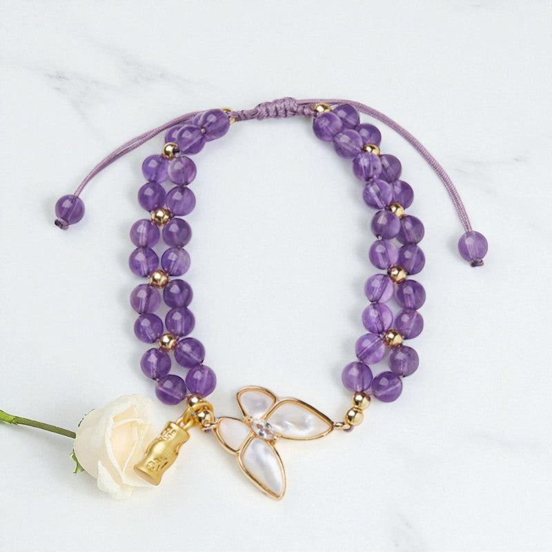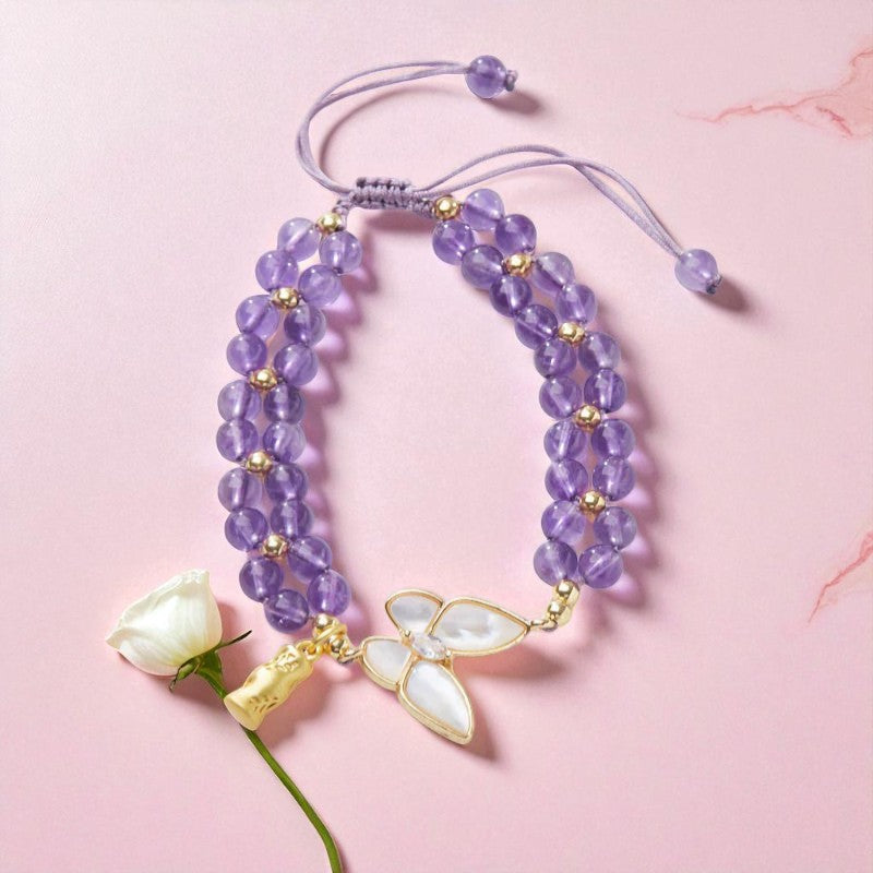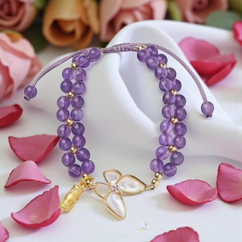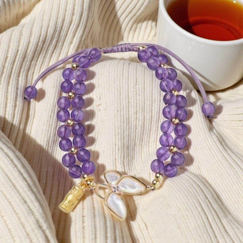 Adorned with a captivating white butterfly centerpiece symbolizing hope and transformation, the Amethyst Braided String Bracelet exudes a sense of serenity. Featuring a finely crafted golden copper bamboo pendant representing resilience and strength, this bracelet's intricate braided design not only adds texture but also fosters a feeling of calm and equilibrium. A gentle reminder to embrace positivity and alleviate stress in your daily life. 💕