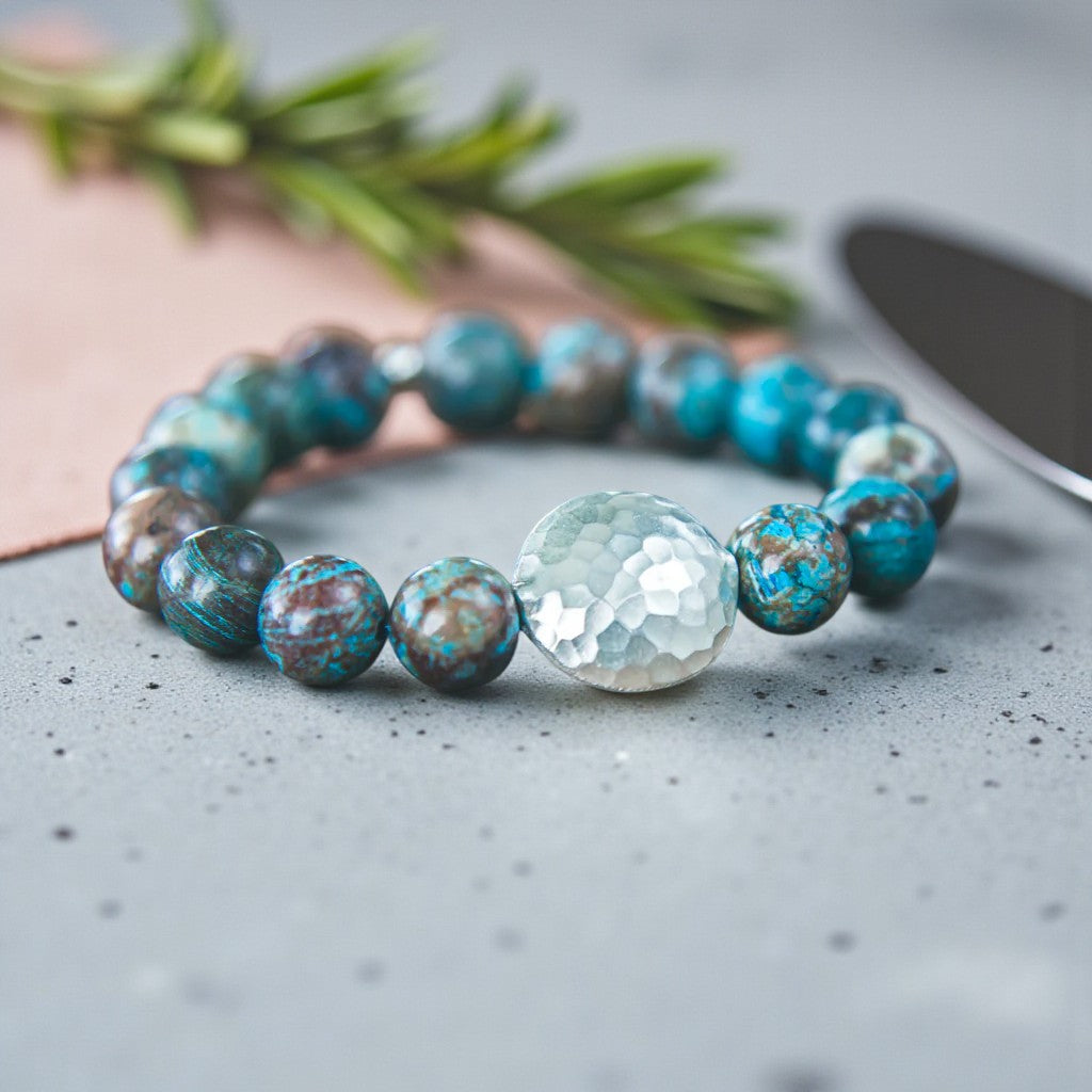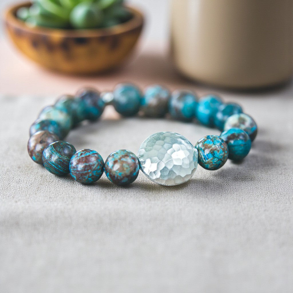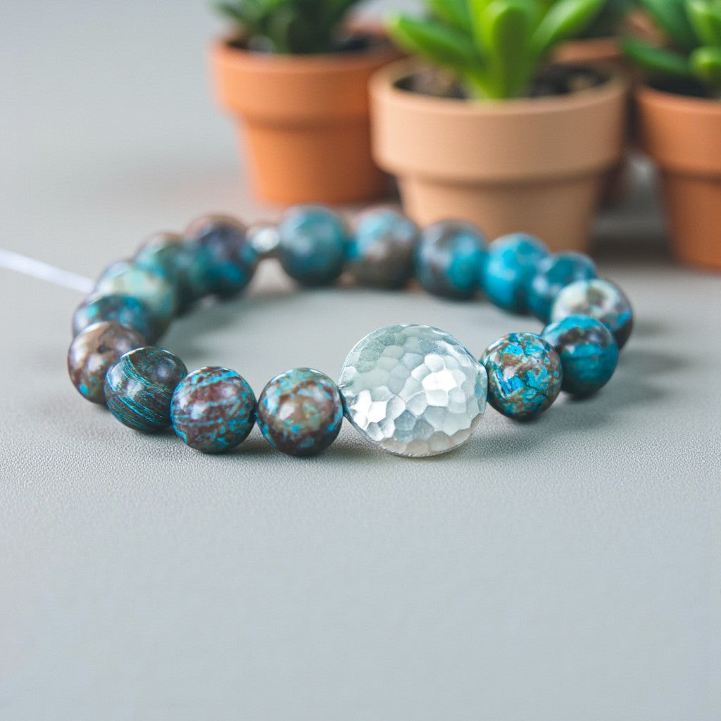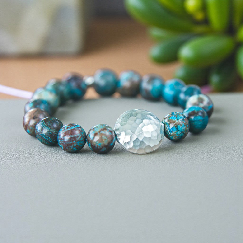 Wearing this Blue Lace Agate bracelet evokes a sense of softness and grace, fostering prosperity, loyalty, and trustworthiness while encouraging personal expression and spiritual development. The array of blue and earthy tones in the design adds to its beauty, with the focal point being the meticulously hand-hammered and chased 100% sterling Thai silver centerpiece. Each piece is crafted by hand, ensuring a unique weight, lustrous satin finish, and distinctive feel.