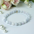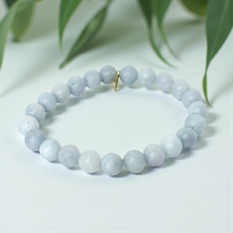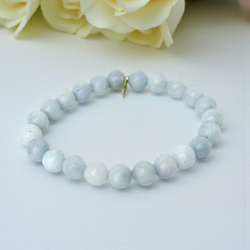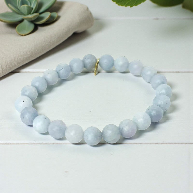 Immerse yourself in the calming energies of the Matte Sky Blue Aquamarine Bracelet, a serene composition of 8mm aquamarine beads with a soothing matte finish. This bracelet is thoughtfully designed to resonate with the Throat Chakra, offering protection, courage, and internal cleansing. Each bracelet is meticulously strung on a sturdy clear elastic cord and adorned with a natural gold Infinite Warrior charm, symbolizing strength and empowerment.