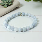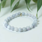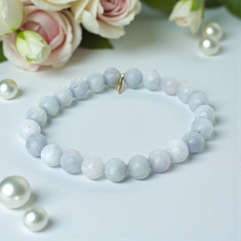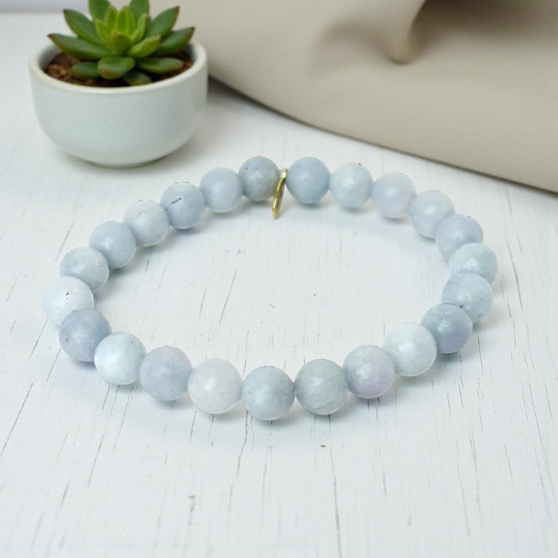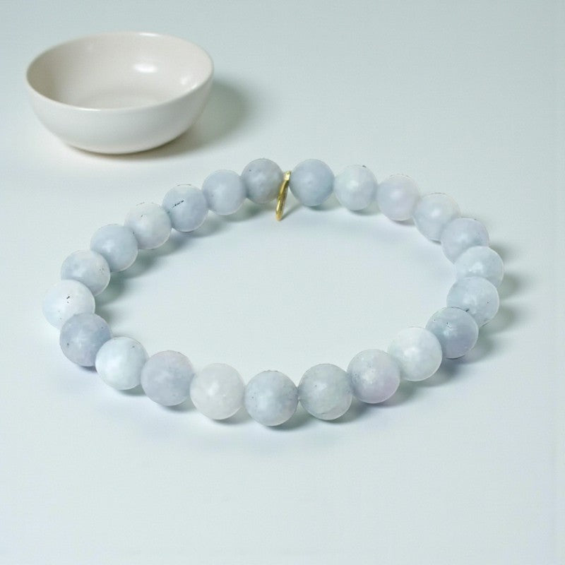 Embrace the protective and soothing energies of the Matte Sky Blue Aquamarine Bracelet, allowing it to guide you towards courage, peace, and emotional balance. Let its tranquil vibrations envelop you, fostering clarity, sensitivity, and harmonious communication as you embark on a journey of self-discovery and healing for your Throat Chakra.