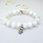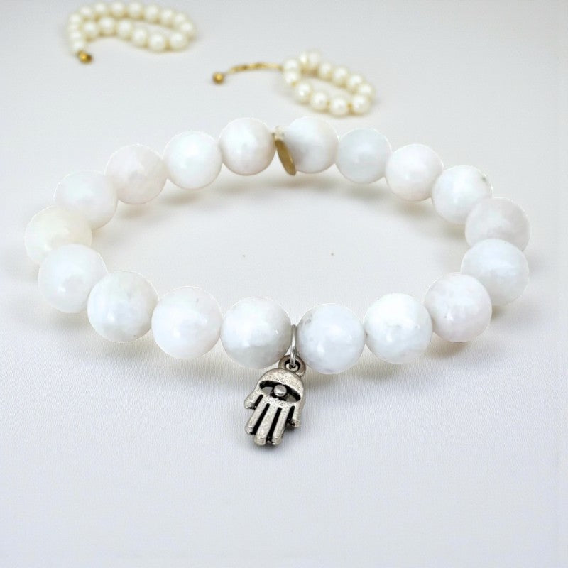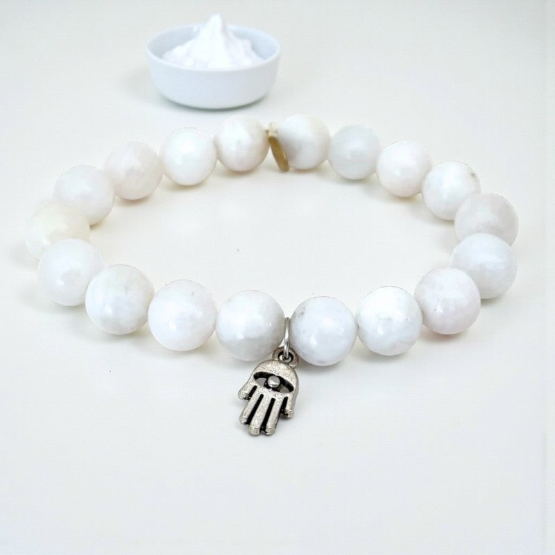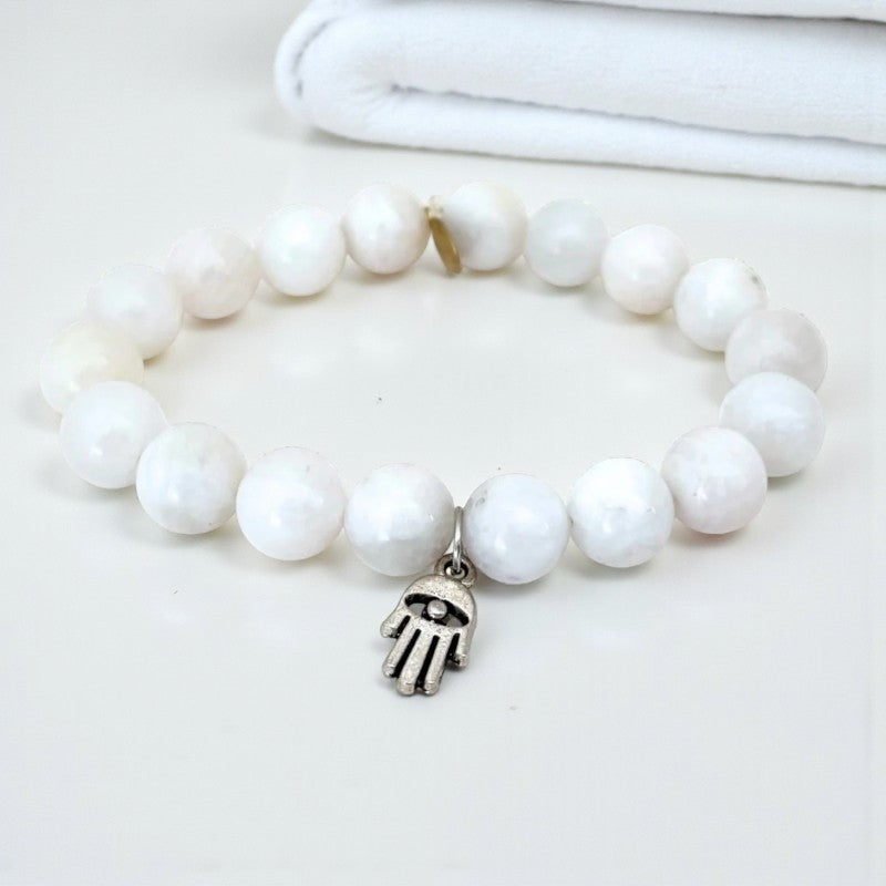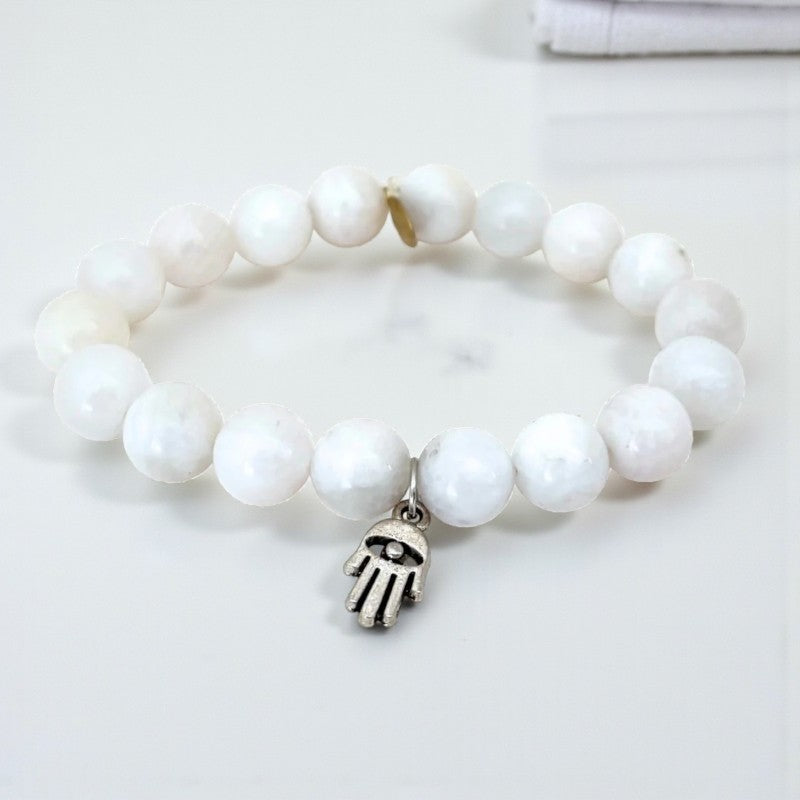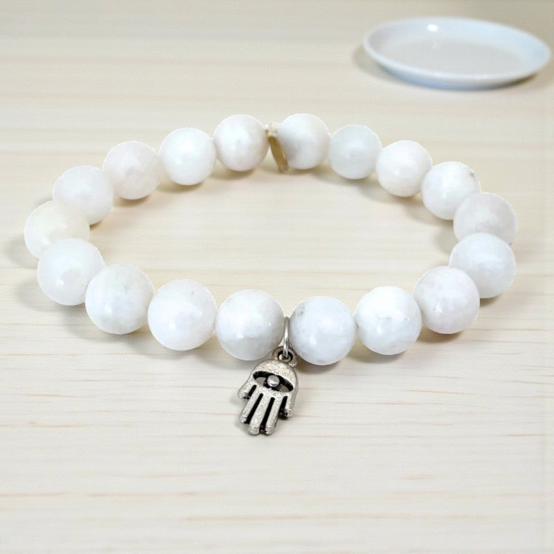 Embrace the transformative energies of the Moonstone bracelet with a silver Hamsa charm, symbolizing protection and blessings. Let its nurturing vibrations guide you towards happiness, love, and success, empowering you to embark on a journey of inner growth, emotional balance, and spiritual insight. Allow the calming energy of Moonstone to soothe your soul, stabilize your emotions, and awaken your intuition as you embrace new beginnings and a renewed sense of hope and strength.