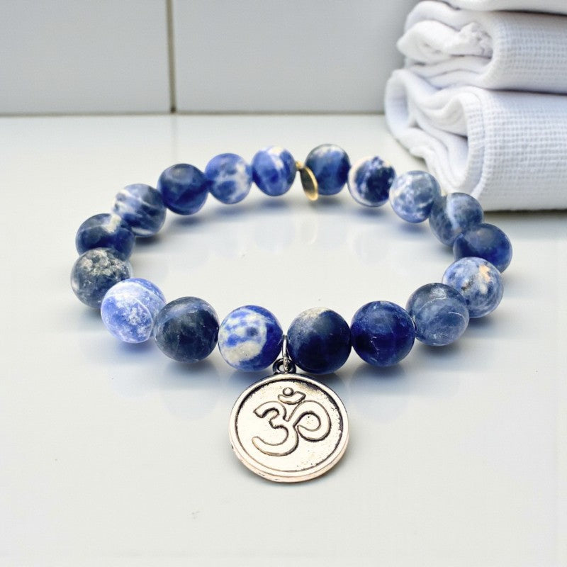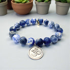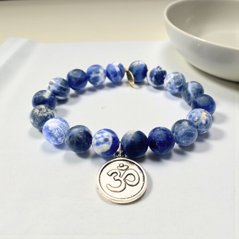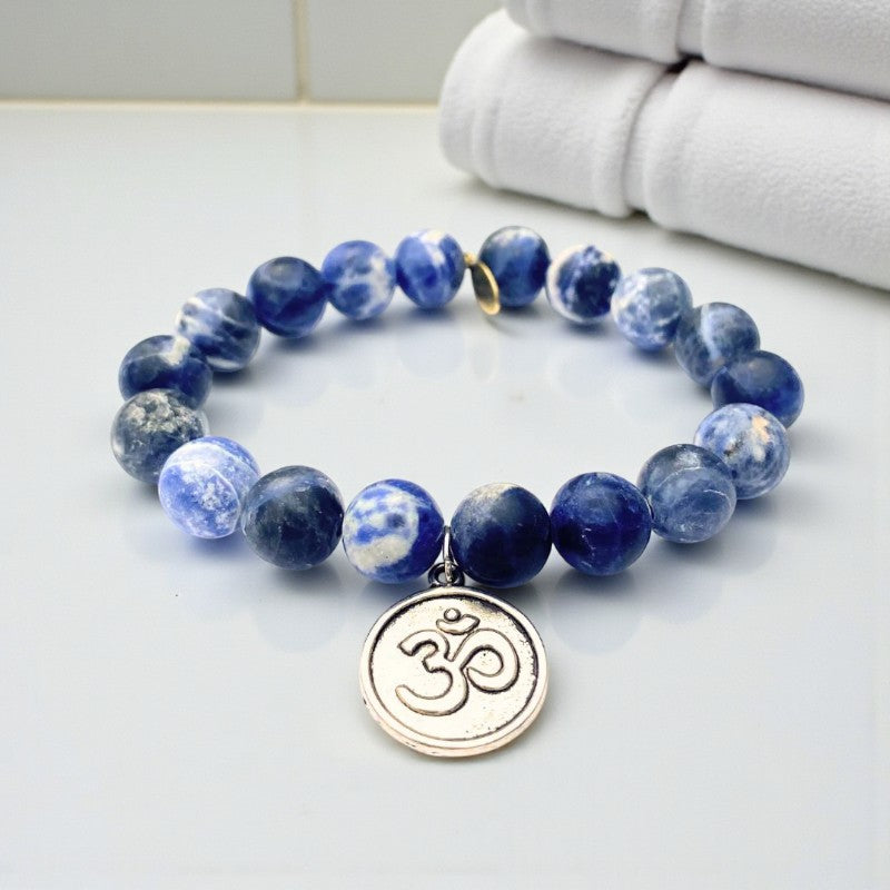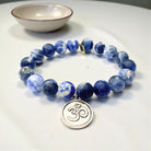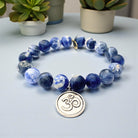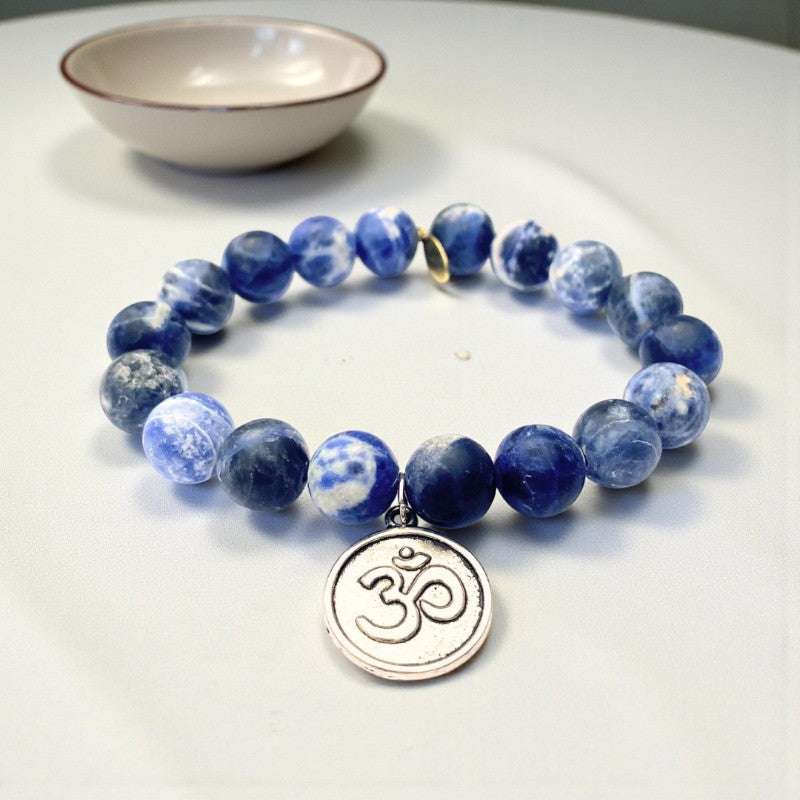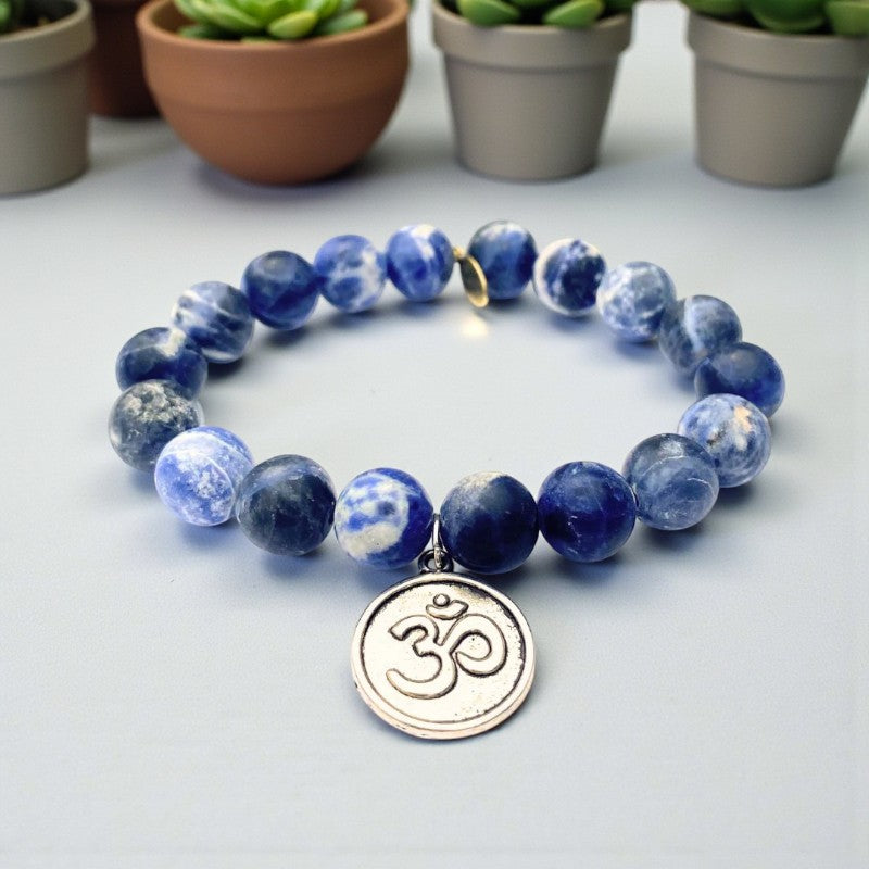 Embark on a harmonious journey of self-discovery and emotional balance with the enchanting Midnight Sodalite crystal bracelet, thoughtfully designed to resonate with the Throat and Third Eye Chakras. This exquisite piece features 10mm matte Midnight Sodalite beads paired with a silver Om charm, serving as a powerful talisman for enhancing various aspects of well-being and spiritual growth.