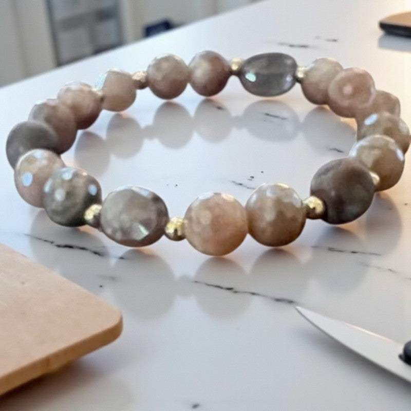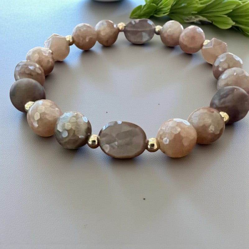 Embrace the ethereal beauty of faceted peach and grey moonstone, each imbued with a mystic allure and gentle essence that resonates with the heart. A crystal of unconditional love and unwavering support, moonstone exudes a soft feminine energy of compassion, peace, healing, and comfort. The delicate hues of these moonstones not only soothe the soul but also bestow an aura of elegance upon the wearer.