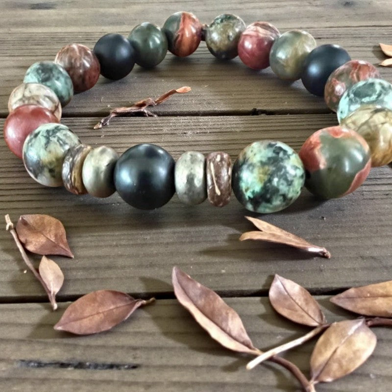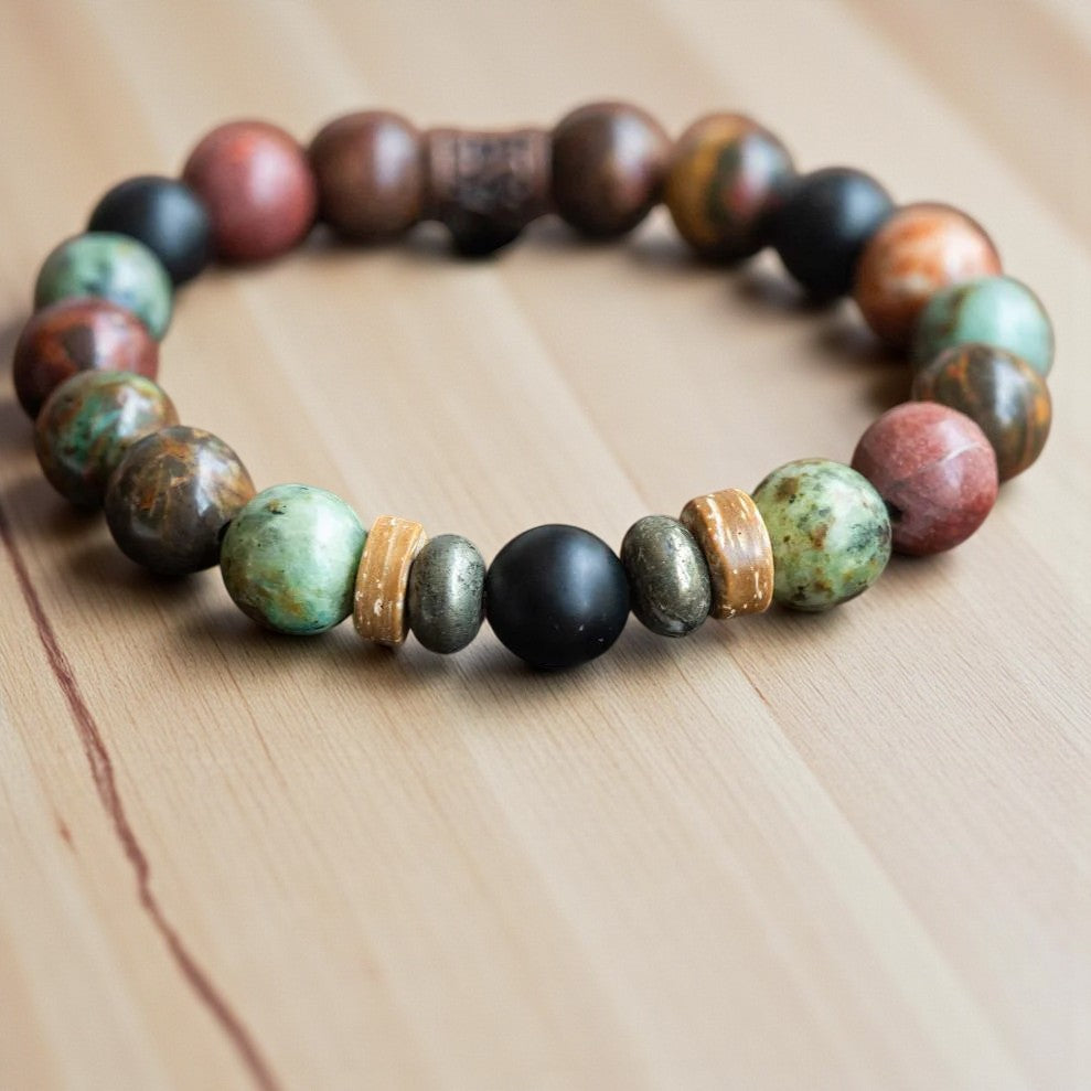 Spiritual Balance Unisex Bracelet: Red Creek Jasper, Pyrite, Buri Wood, African Turquoise, Blackstone Fusion