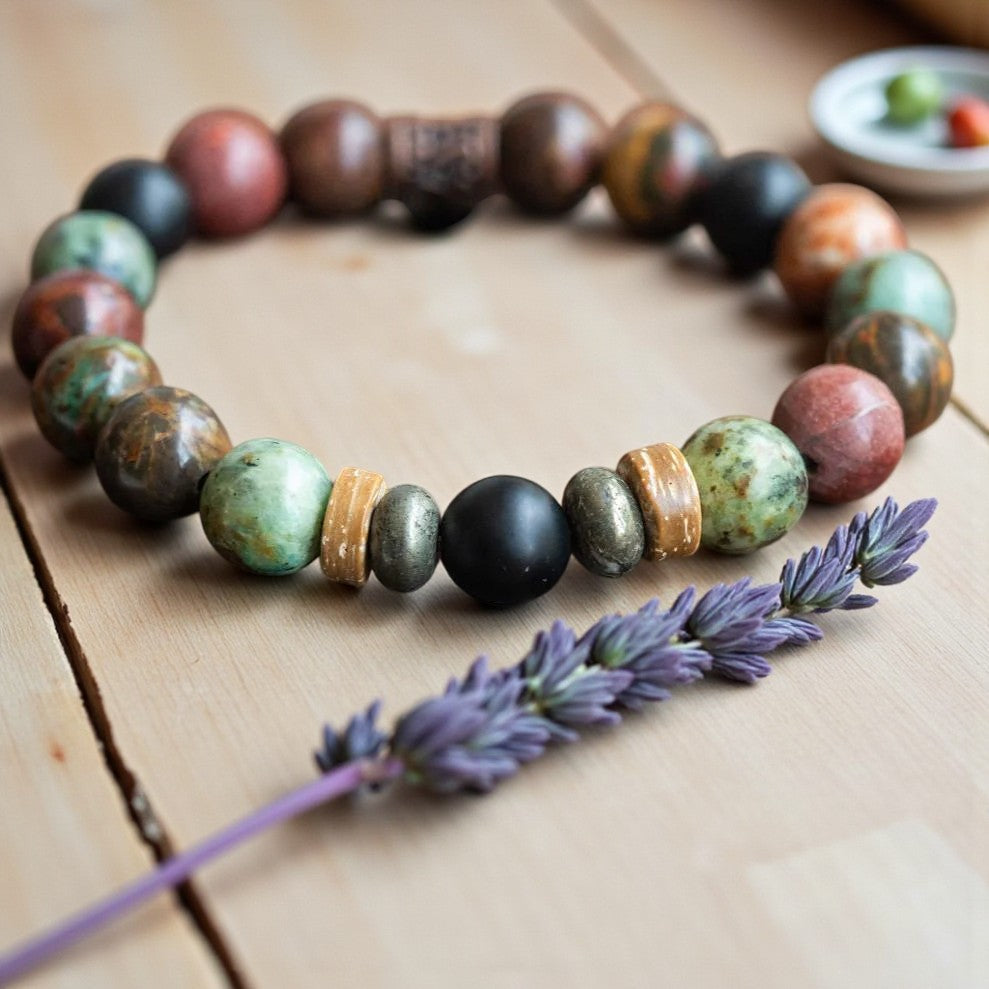Discover the essence of harmony and balance with our Harmony Fusion Unisex Bracelet, designed to unite the mind, body, and soul in perfect alignment. Crafted with a thoughtful arrangement of Blackstone, Buri Wood, Red Creek Jasper, Pyrite, and African Turquoise, this bracelet radiates positivity and offers support in various aspects of life, whether worn individually or shared as a couple. *Please specify female or male sizing when ordering.*
