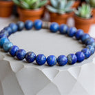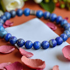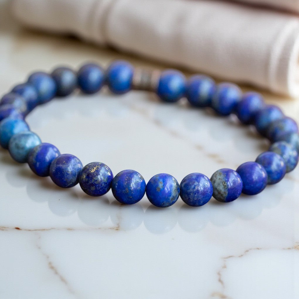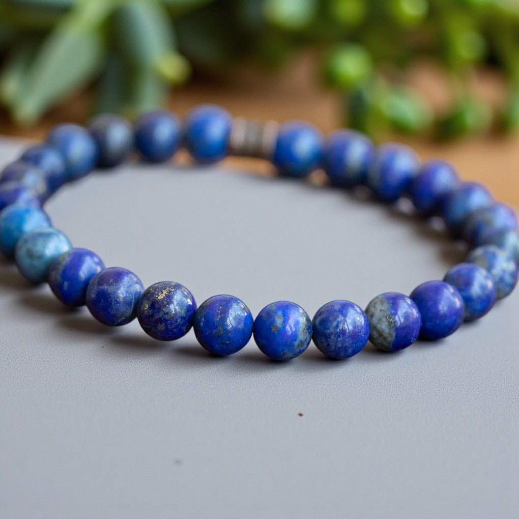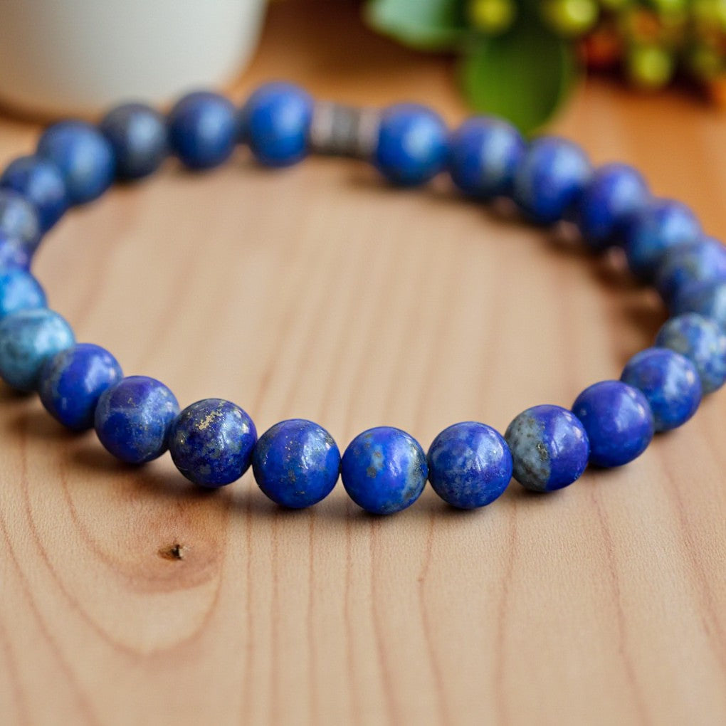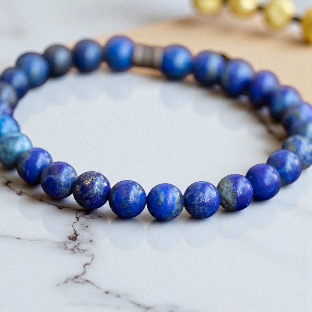 The lapis lazuli stones showcased in this bracelet are truly enchanting, each bearing a unique allure with its deep blue hue and scattered golden specks reminiscent of a starlit sky. Beyond its visual appeal, the blue and gold fusion symbolizes inner wisdom, confidence, and spiritual insight, embodying a stone of profound significance historically revered by royalty and scholars. Associated with the third eye and throat chakras, lapis lazuli stands as a beacon of truth, self-expression, and enlightenment.