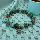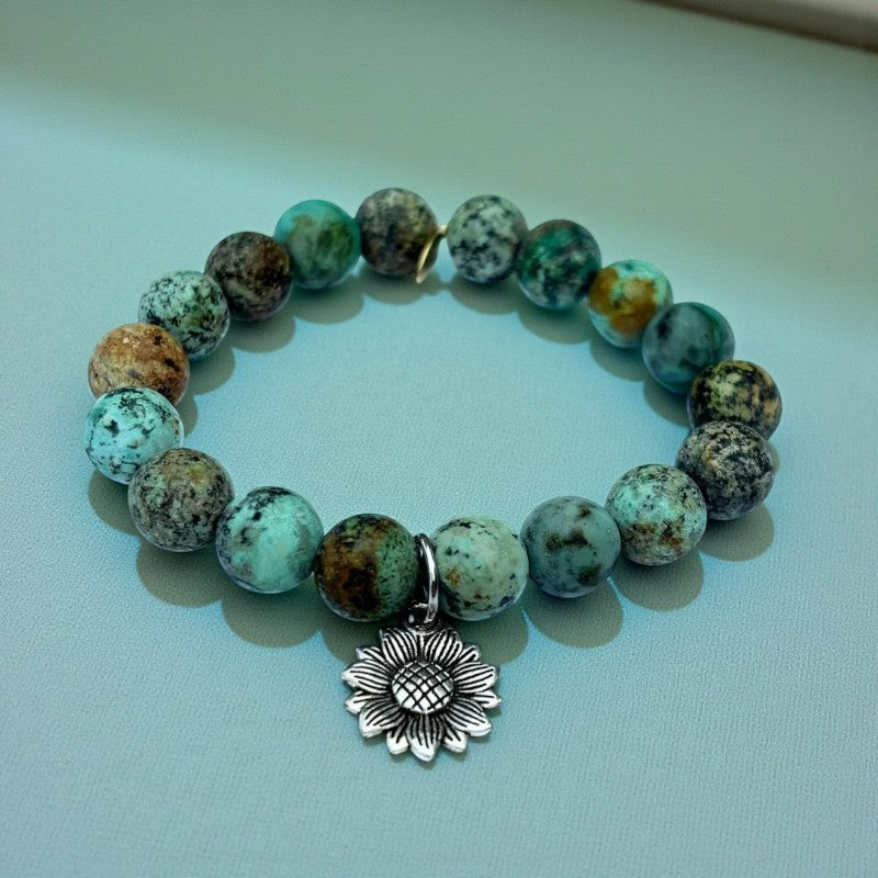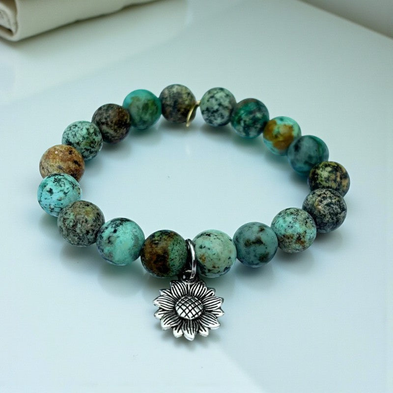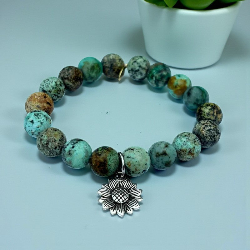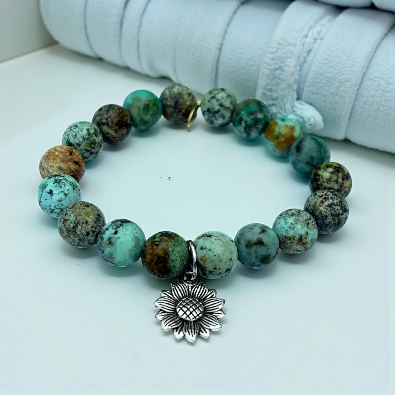 Sunflower Bracelet with African Turquoise Beads and Silver Sunflower Charm