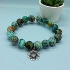 Experience the transformative energies of the Matte African Turquoise bracelet, meticulously crafted to resonate with the Heart, Throat, and Third Eye Chakras. This exquisite piece features 10mm Matte African Turquoise beads adorned with a silver sunflower charm, offering a harmonious blend of energies to support holistic well-being and spiritual growth.